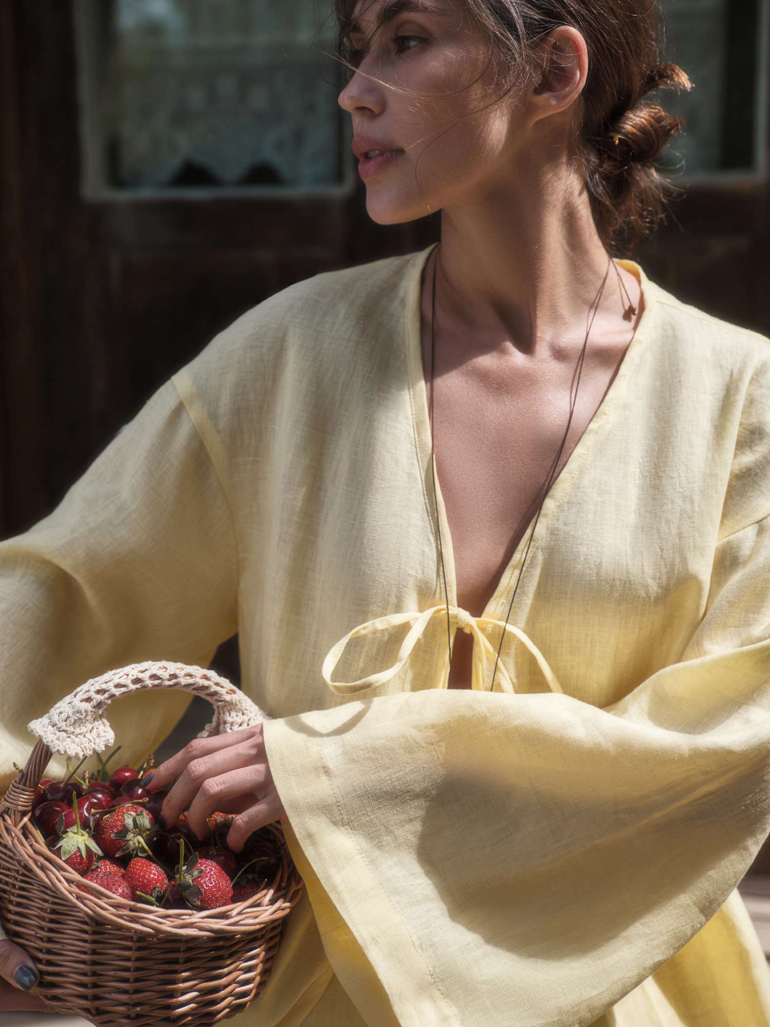 Свободный силуэт, спущенное плечо и длина в пол создают эстетику bohemian chic. Аккуратный бант вместо пуговиц добавляет романтичную нотку.