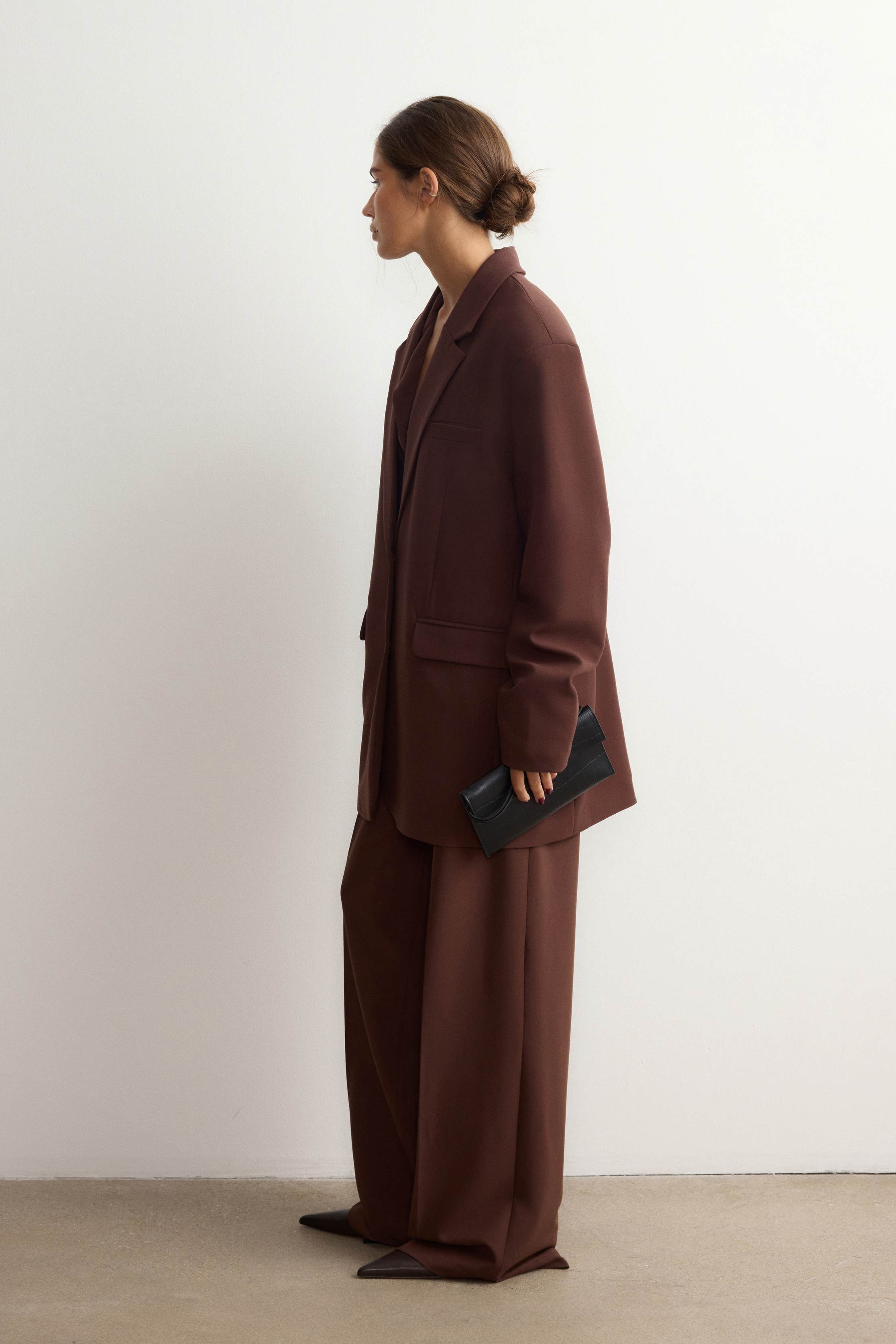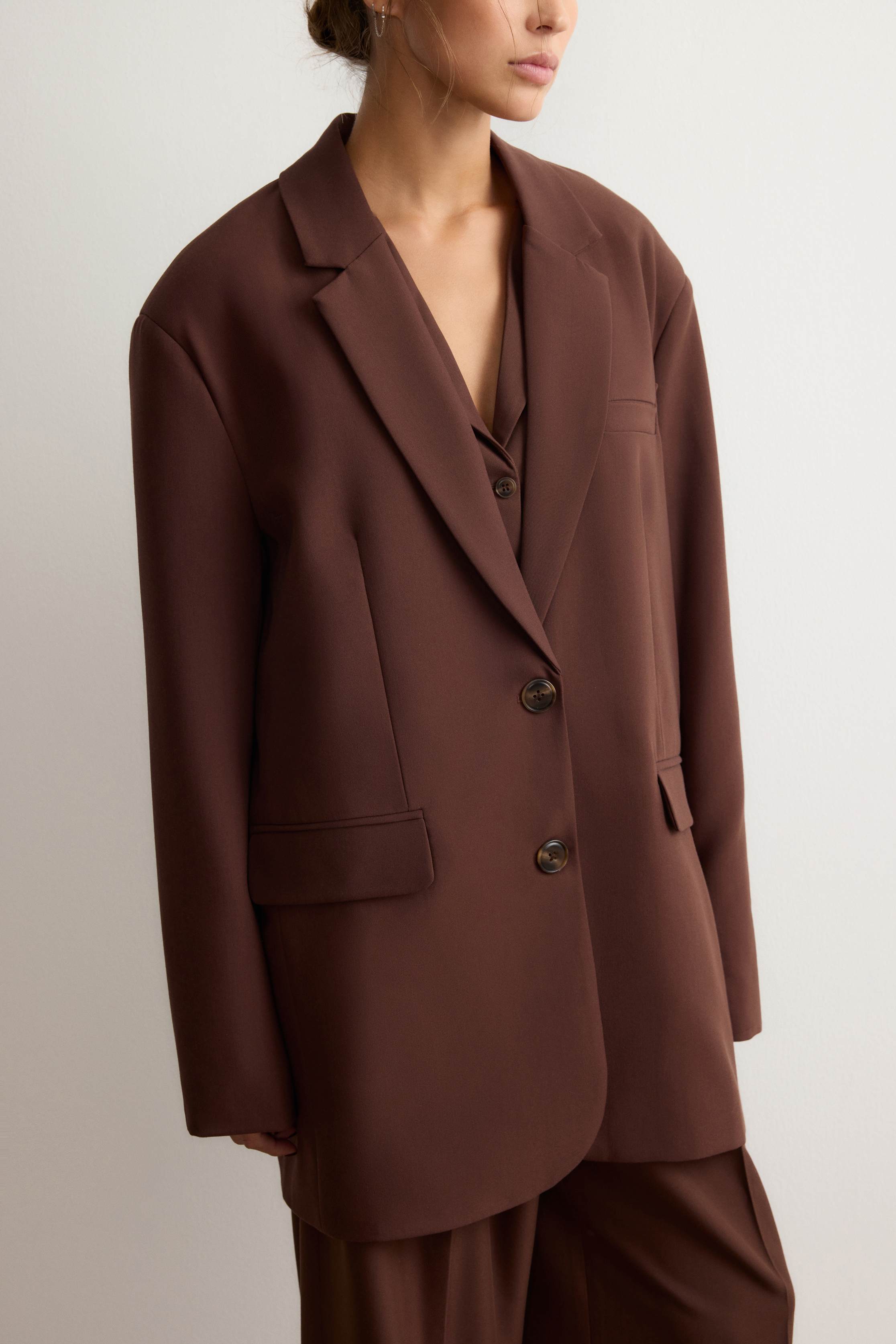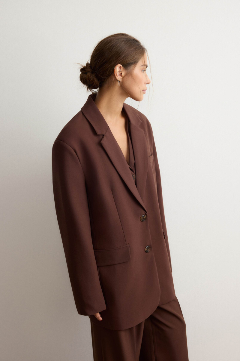 Однобортный жакет с широкими прямоугольными лацканами — классика, помноженная на функциональность и комфорт. Разработали жакет таким образом, чтобы он идеально сочетался с юбками и платьями длины мини и заканчивался на линии подола. Модель со шлицей, нагрудным карманом и боковыми клапанами застегивается роговыми пуговицами. Выполнен из костюмной ткани на основе шелковистой вискозы с мягким хлопковым подкладом.
