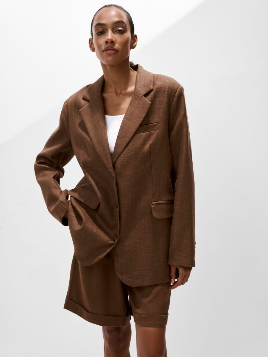 Мы предлагаем сыграть на контрастах, накинув пиджак на аккуратное платье мини, или составить гармоничный комплект с брюками или шортами-бермудами из нашей коллекции.