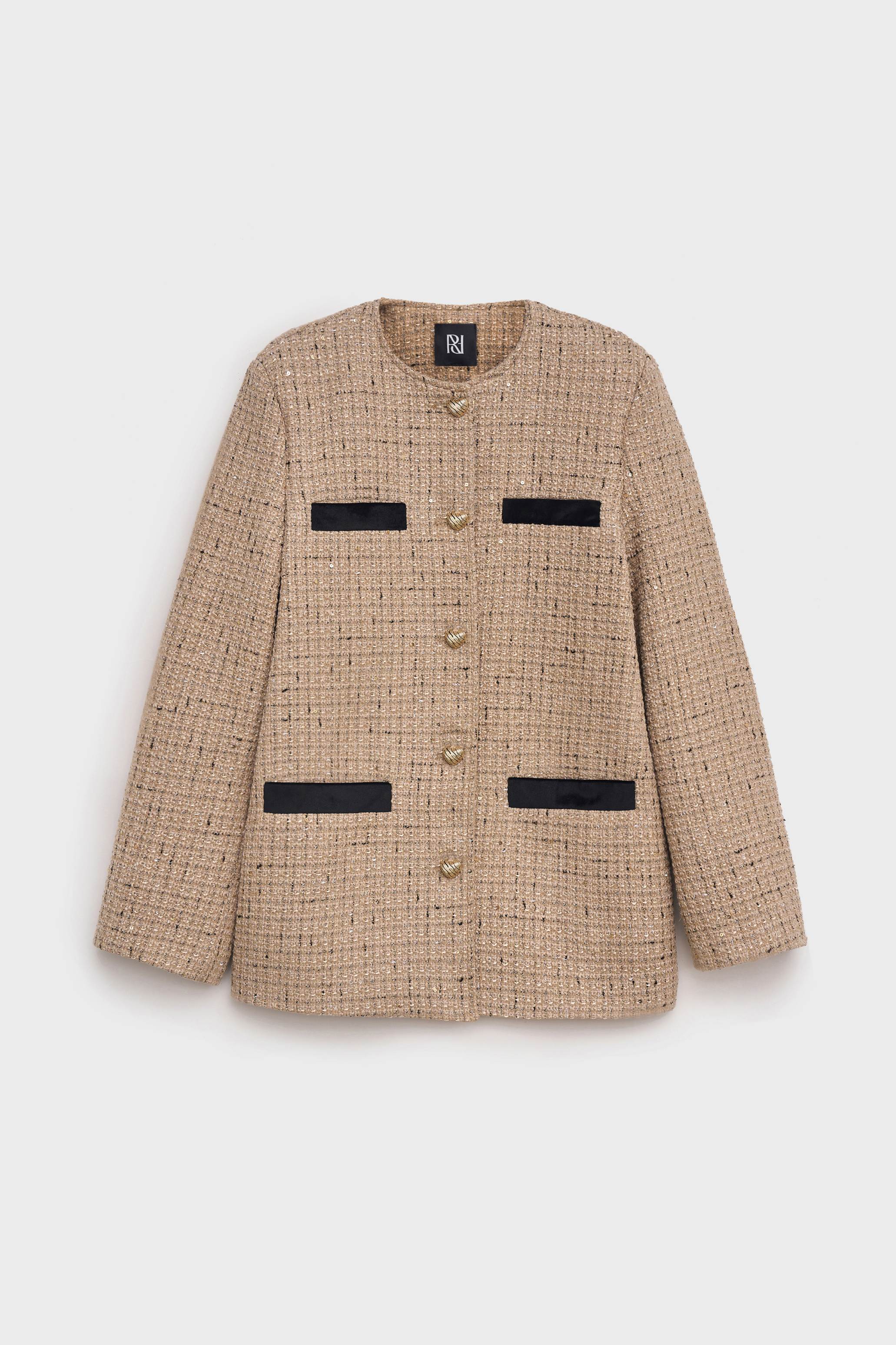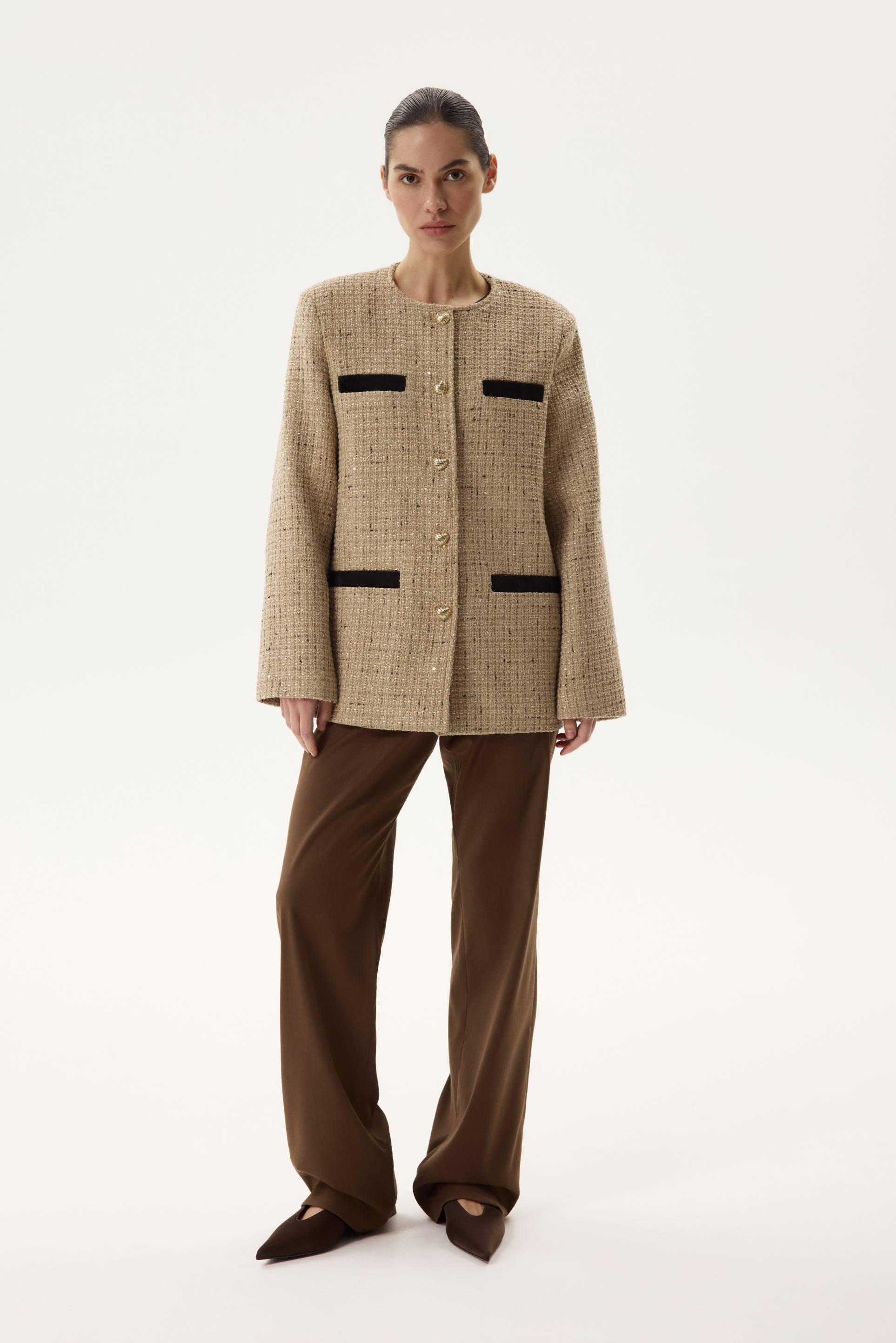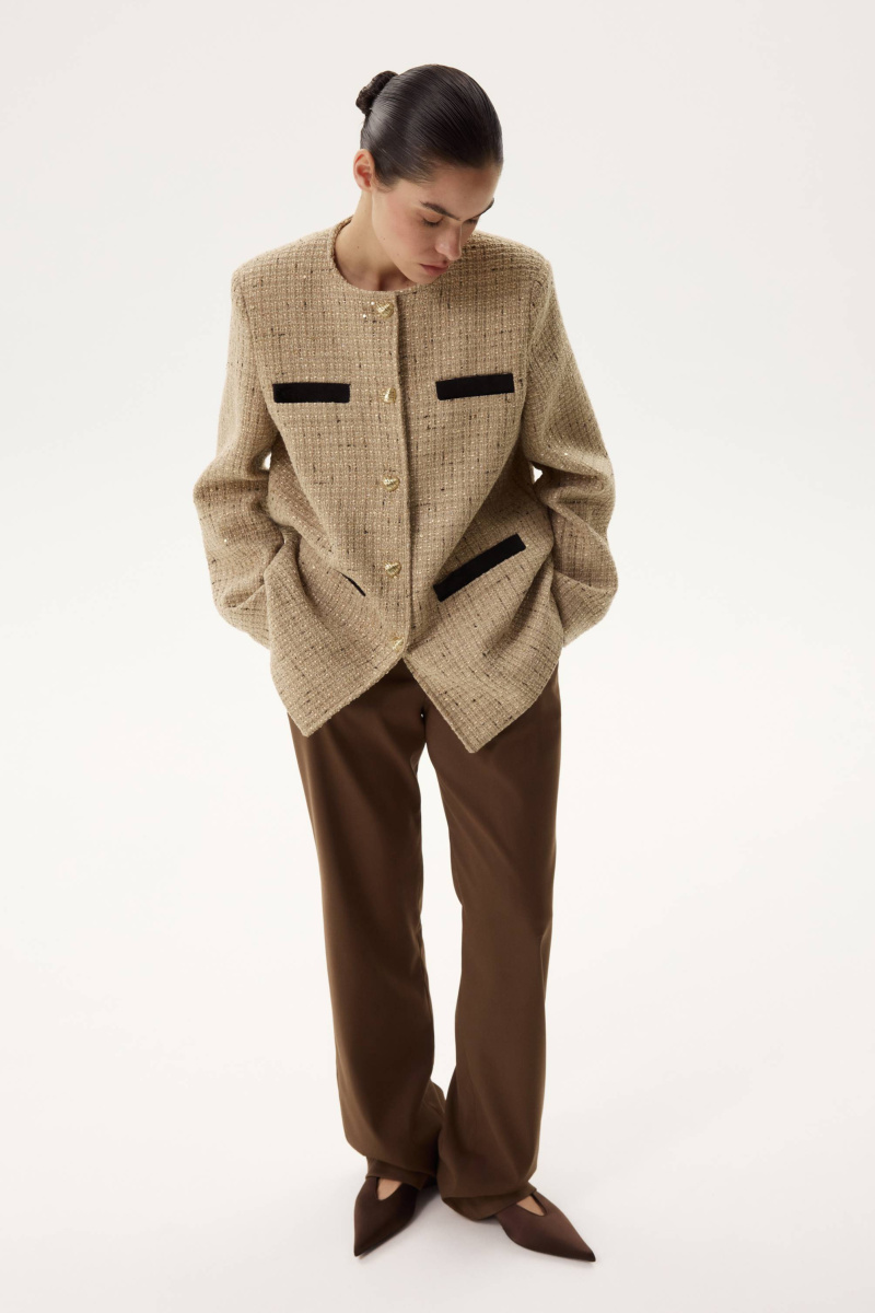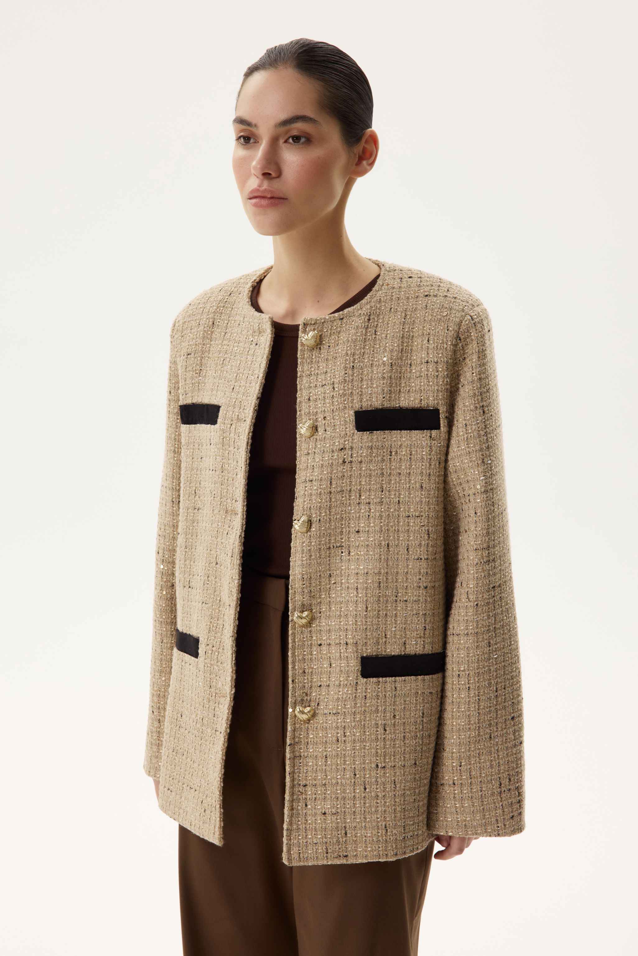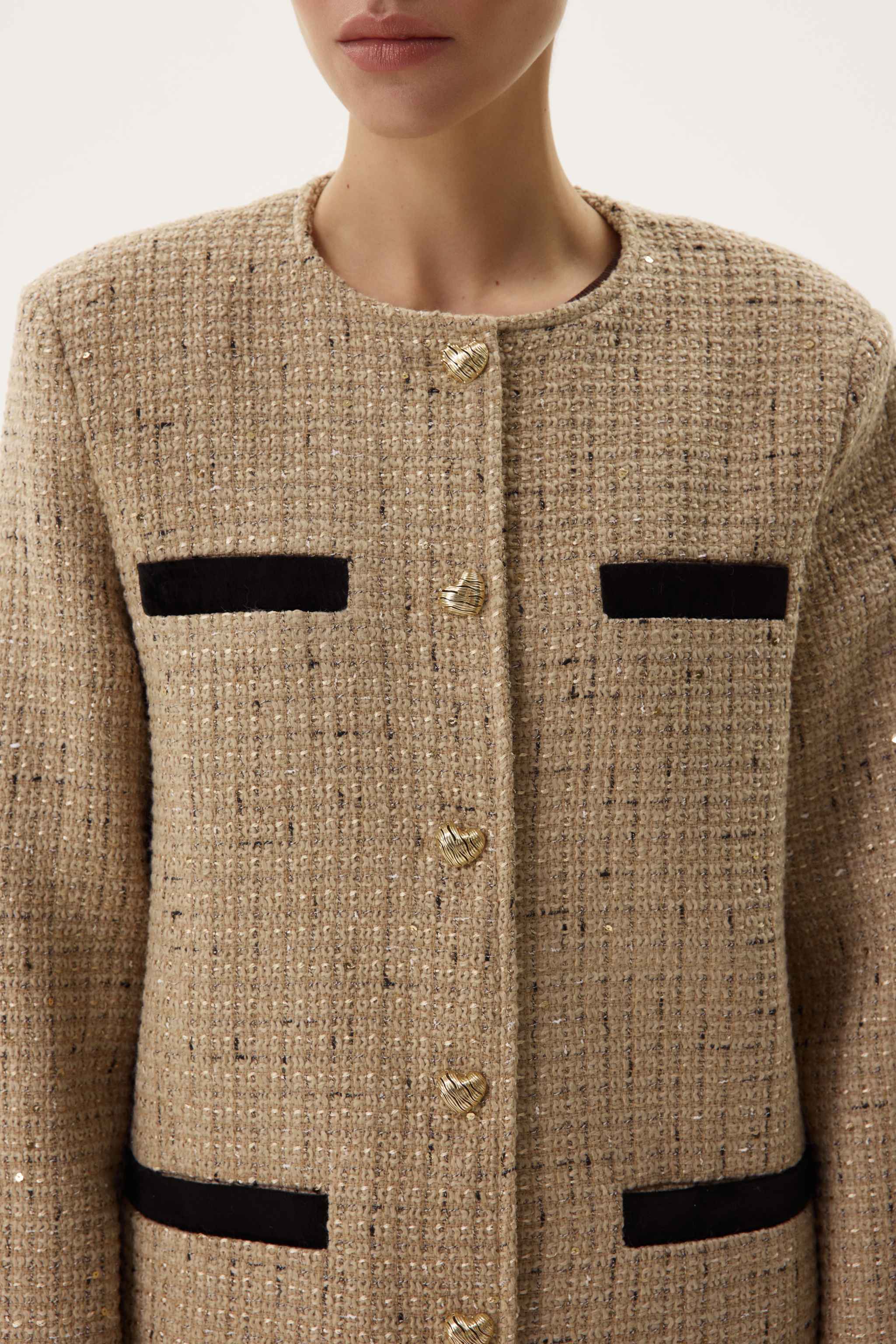 Новинка выполнена из твида с вплетением блестящей нити и вкраплением пайеток. Застегивается на фактурные металлические пуговицы в виде сердца.