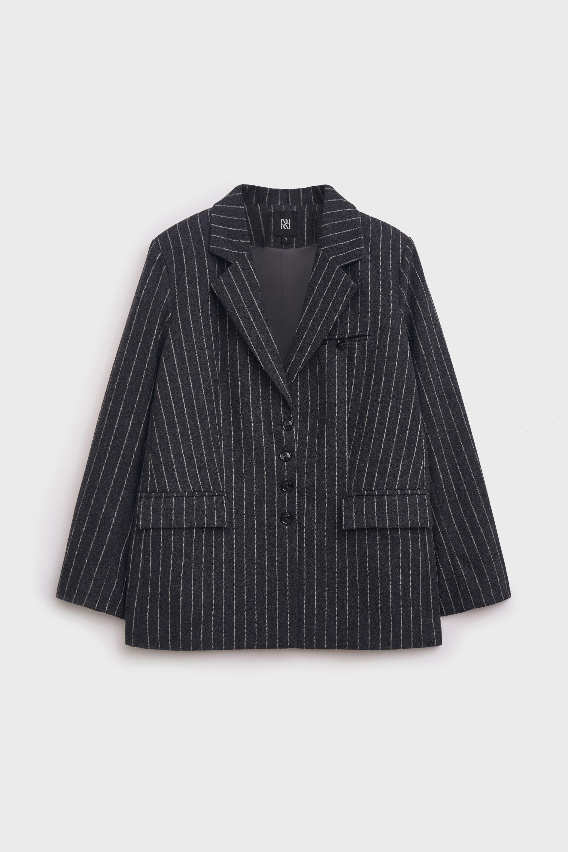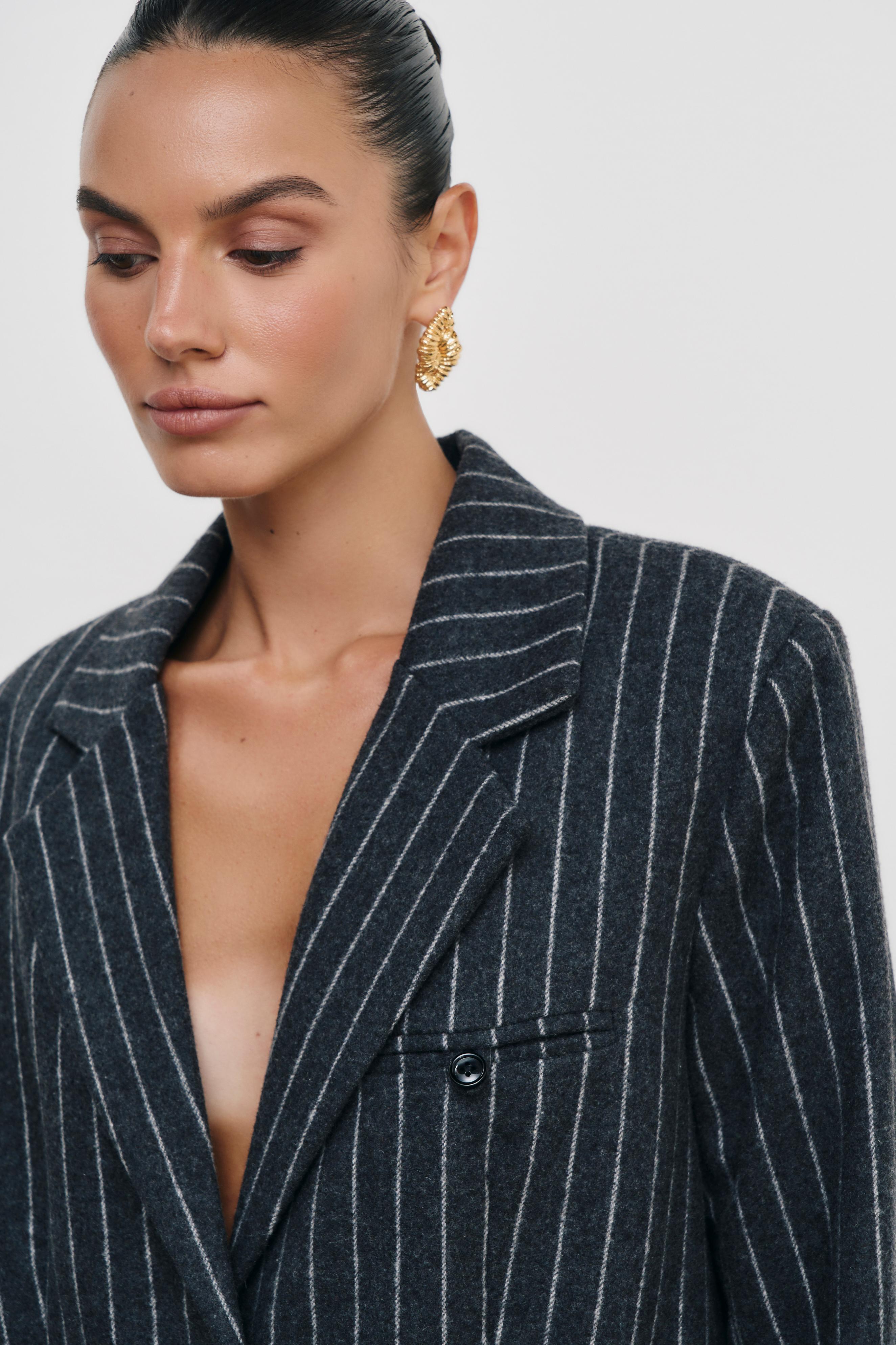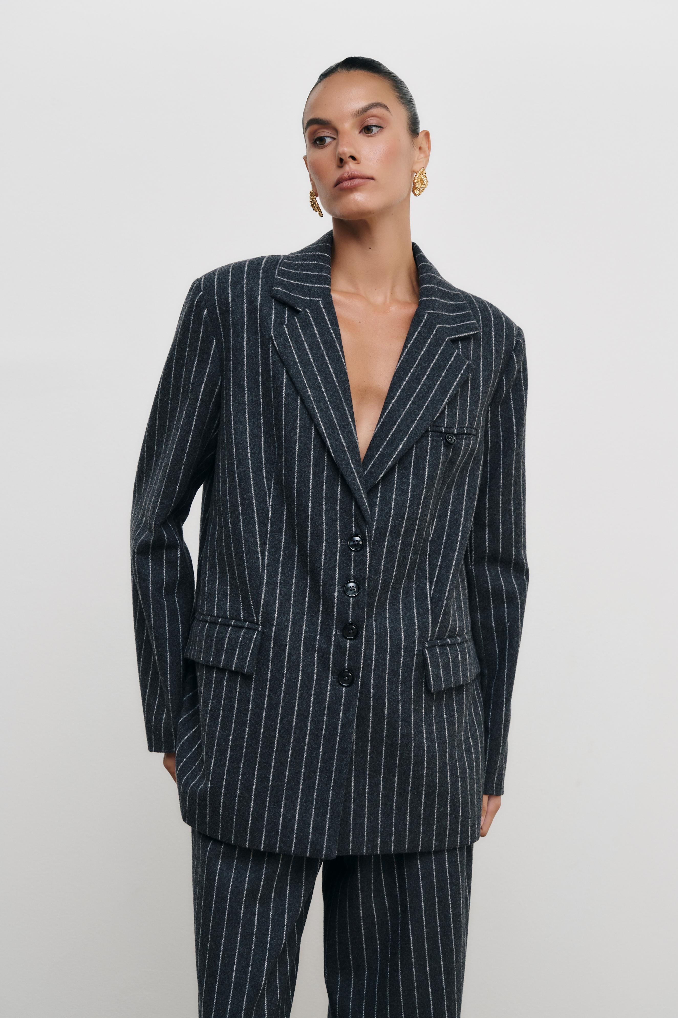 Пиджак напоминает мужской благодаря прямому крою, лацканам и прорезному карману на груди, а спущенное плечо смягчает силуэт.