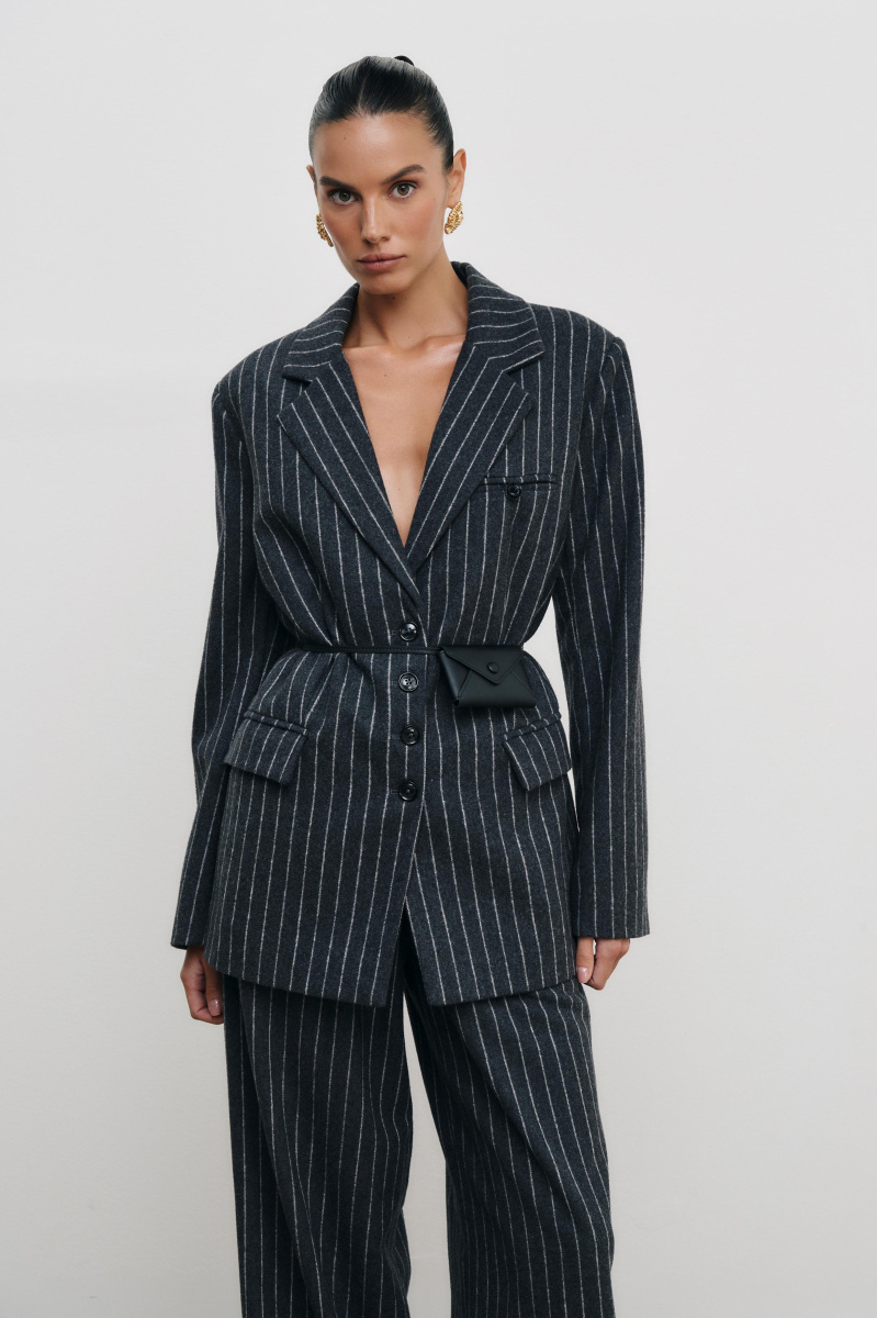 Новинка выполнена из мягкой и тактильной костюмной ткани с добавлением натуральной шерсти. Тонкие вертикальные линии визуально стройнят и вытягивают фигуру, при этом выглядят строго и лаконично.