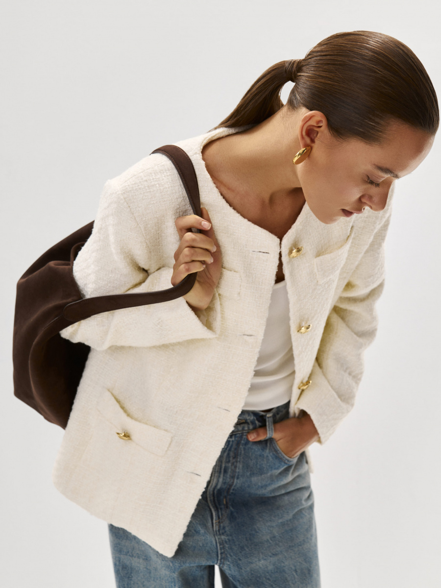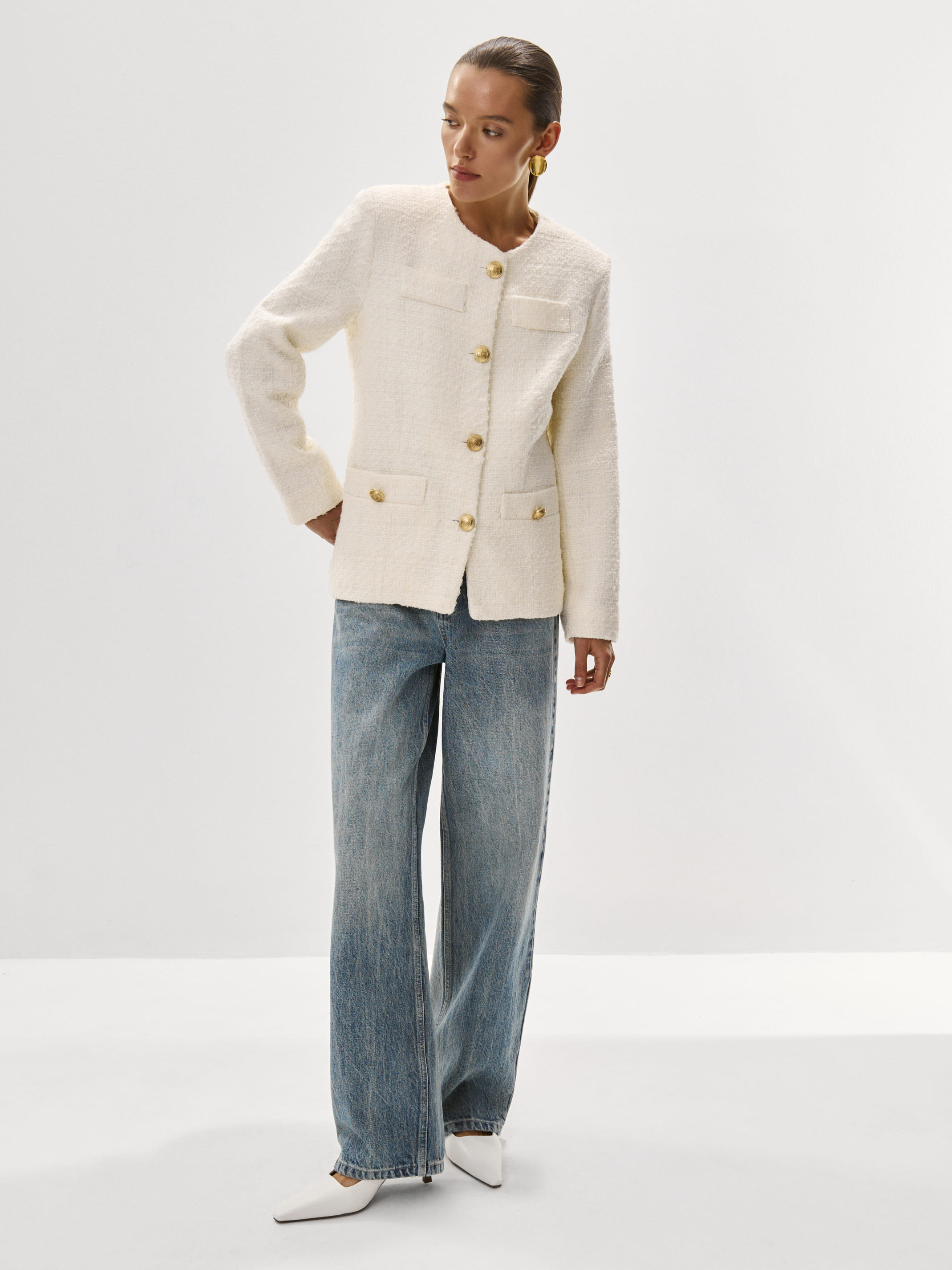 Свободный, чуть приталенный жакет с четкой линией плеч — эта комфортная модель будет уместна и на торжественном мероприятии, и на прогулке в городе весной.
