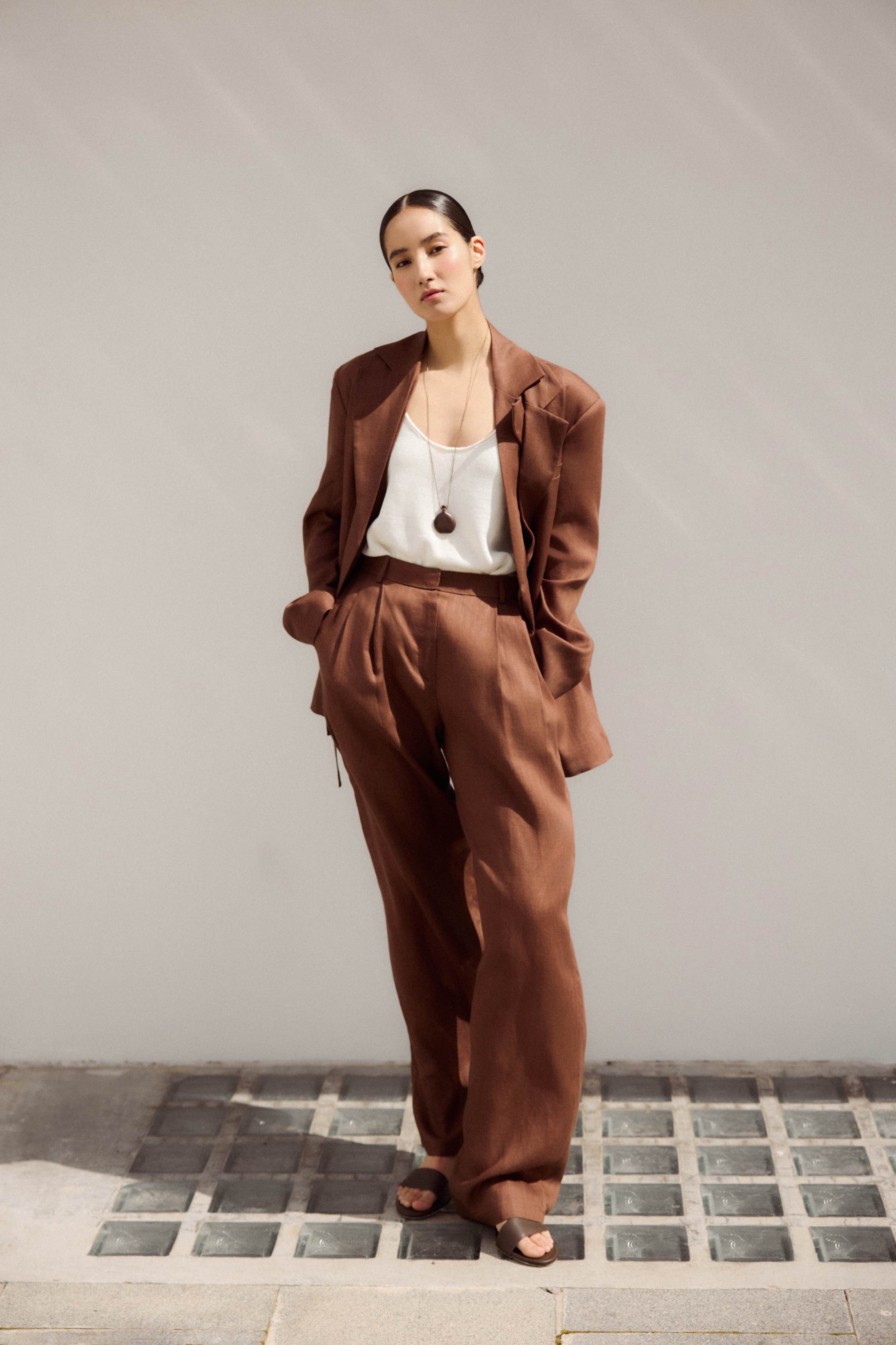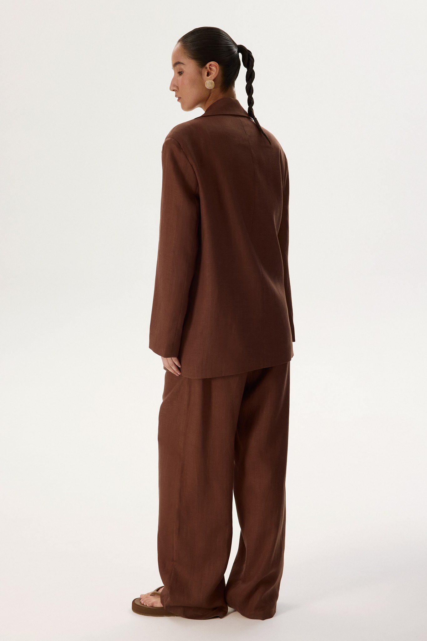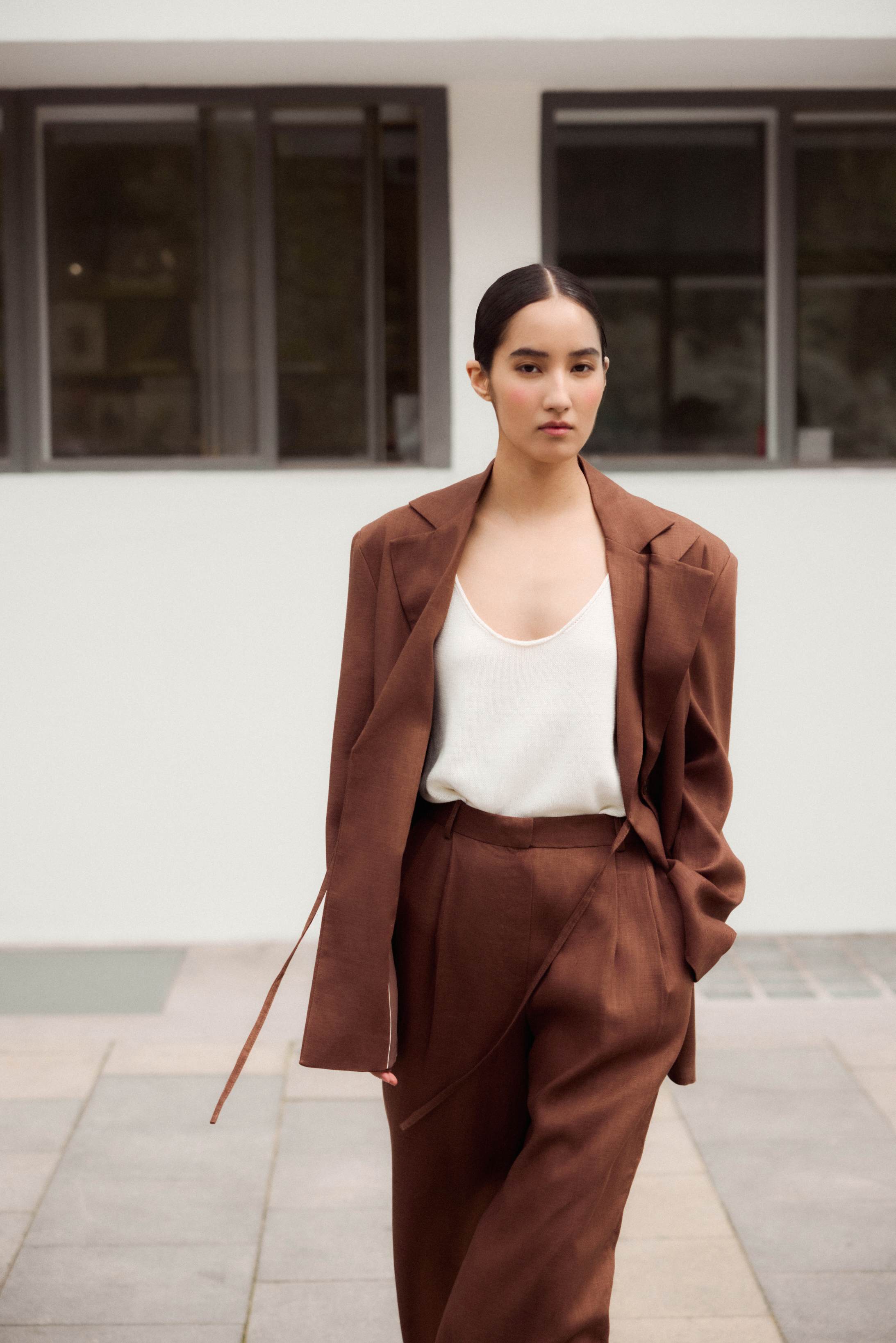Новинка выполнена изо льна с фактурой «елочка» — такой материал отлично пропускает воздух и отводит влагу, а также ощущается на теле приятной прохладой. Для подкладки был выбран 100% натуральный хлопок, чтобы обеспечить дополнительную мягкость и комфорт.