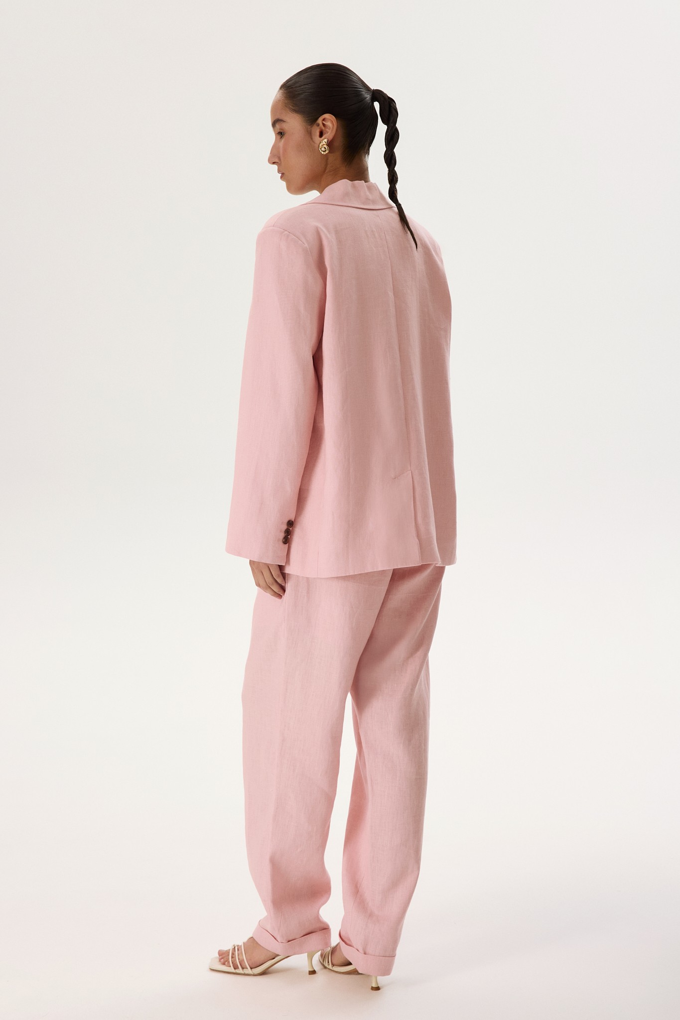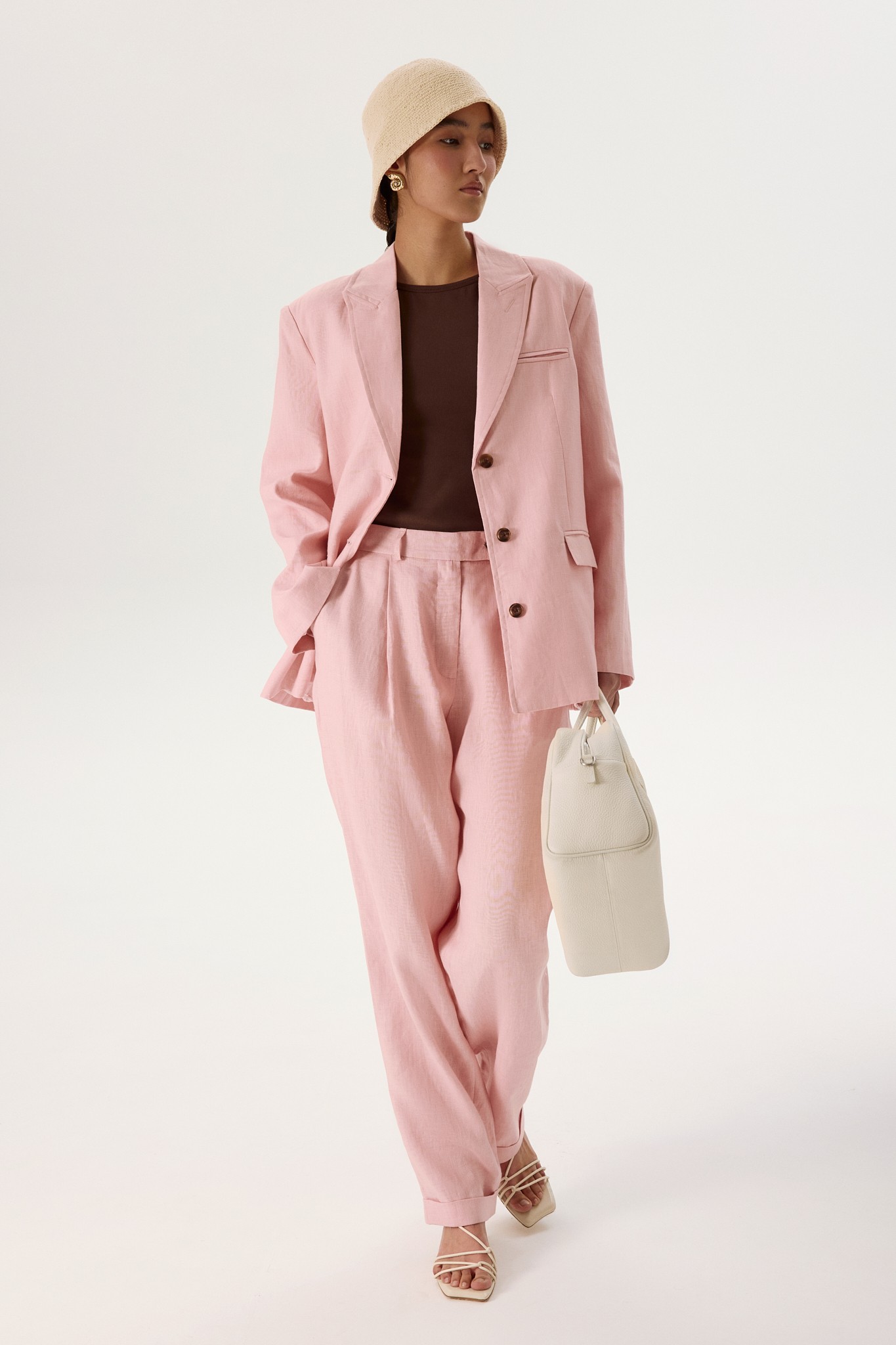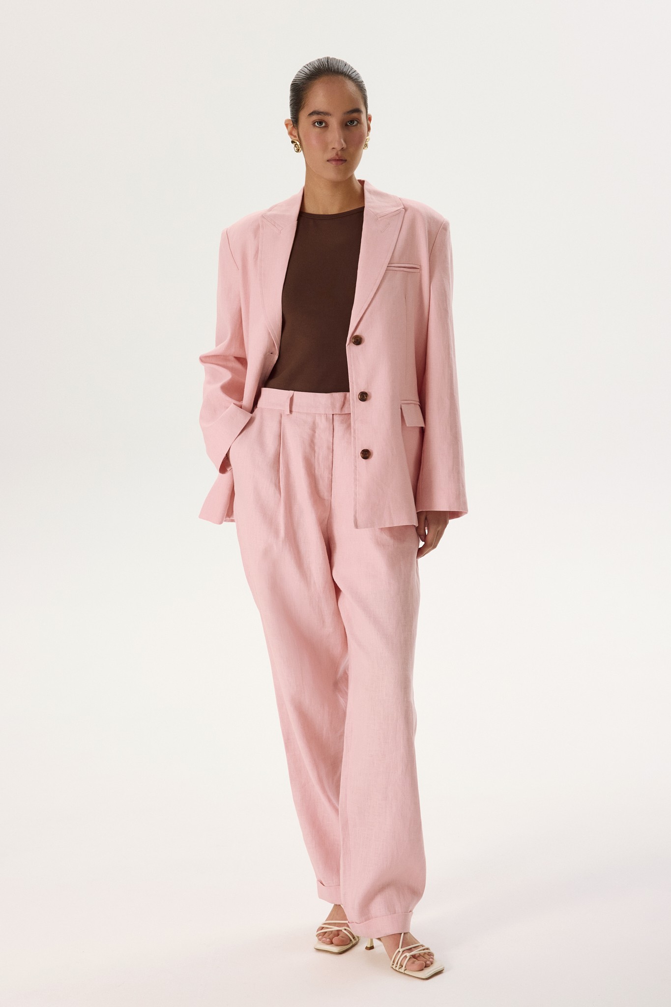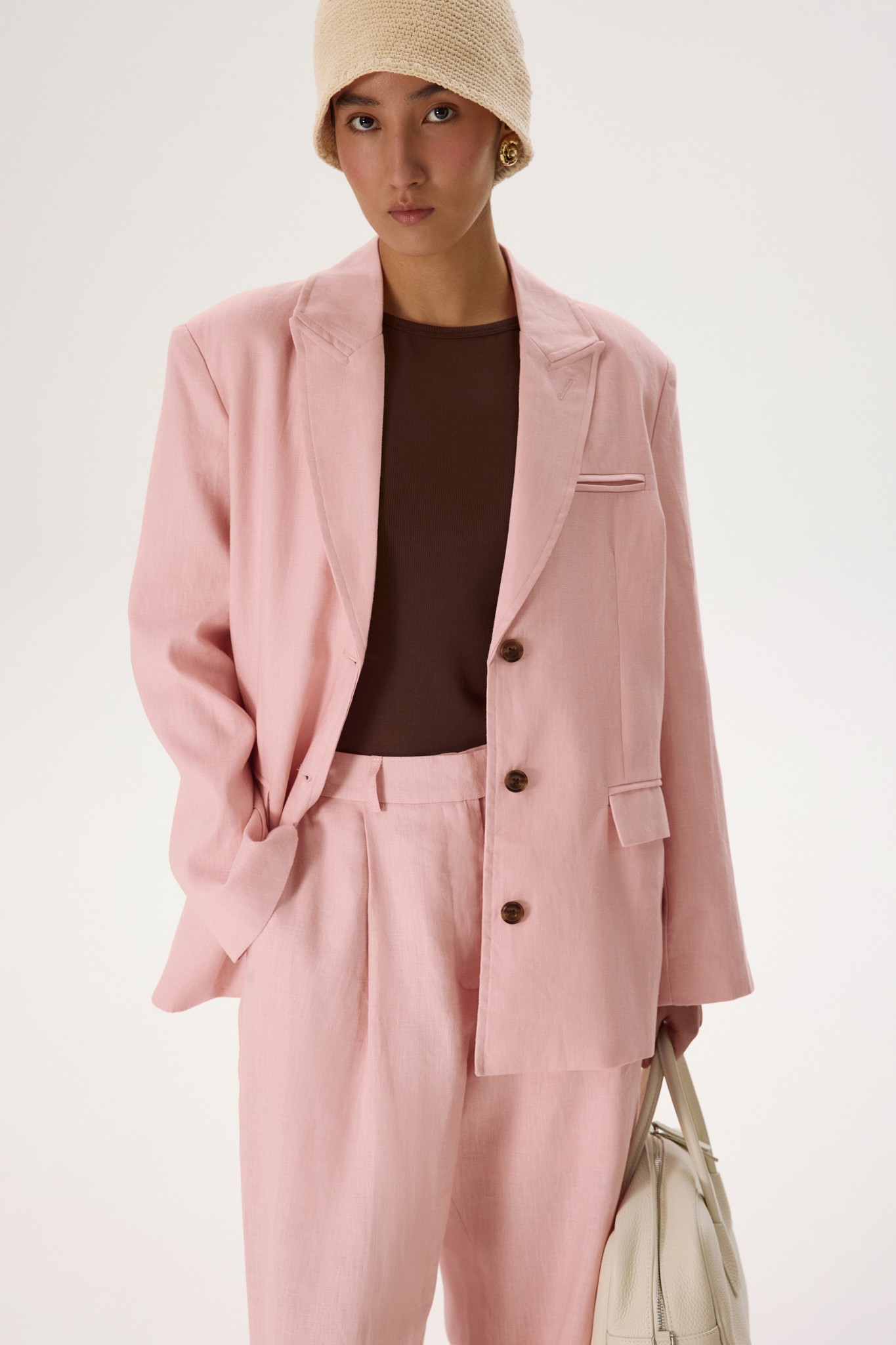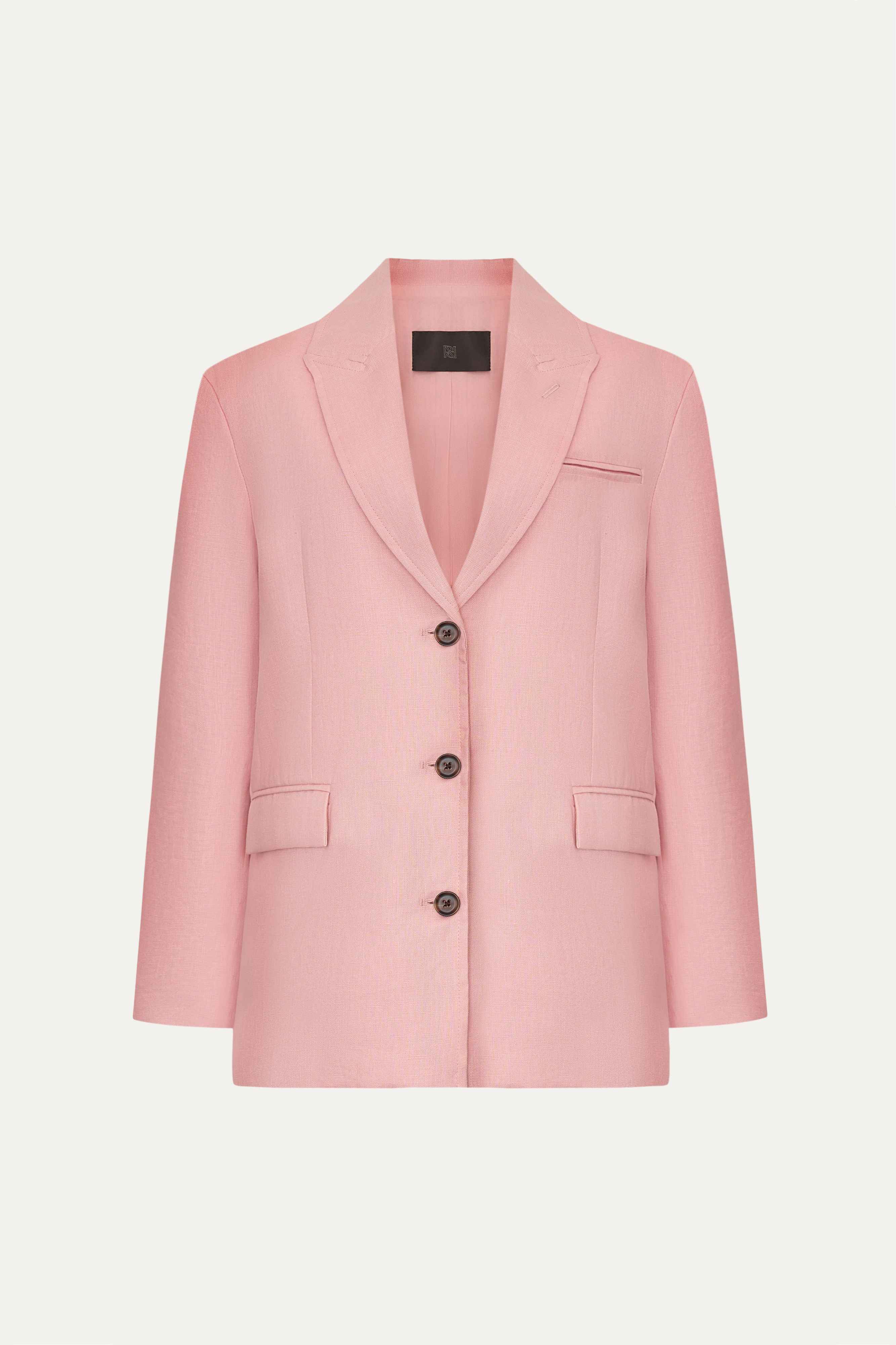 Прямой силуэт и однобортный крой, аккуратные лацканы и боковые карманы с клапанами делают жакет чистым воплощением классики. Шоколадные пуговицы контрастируют с нежно-розовым оттенком, добавляя образу яркий акцент.