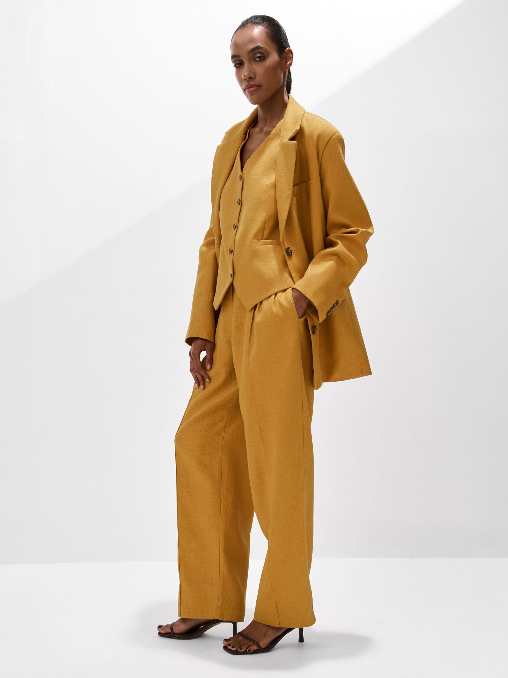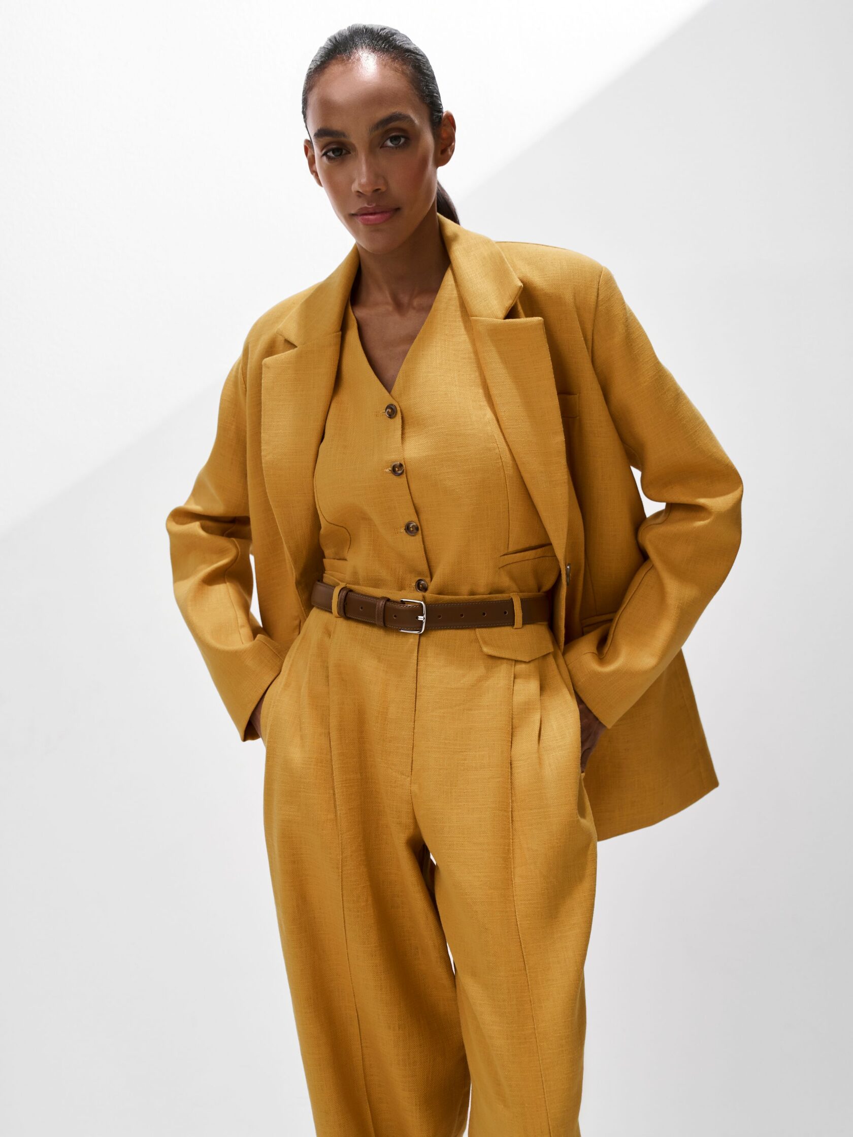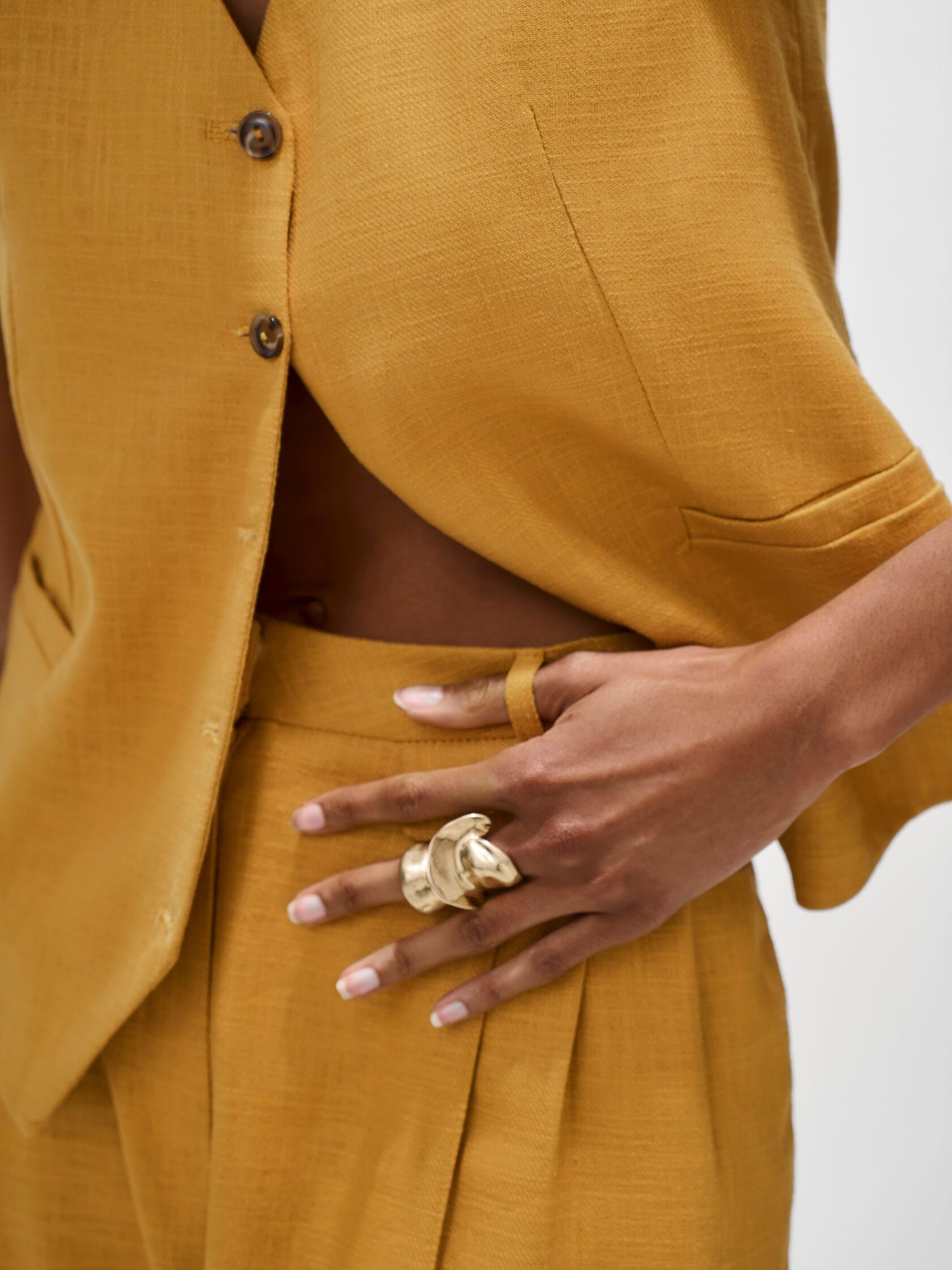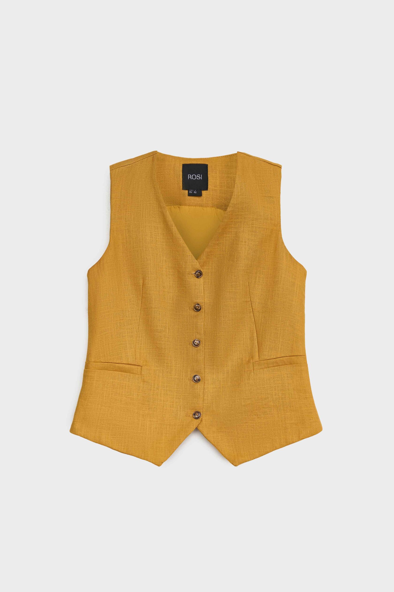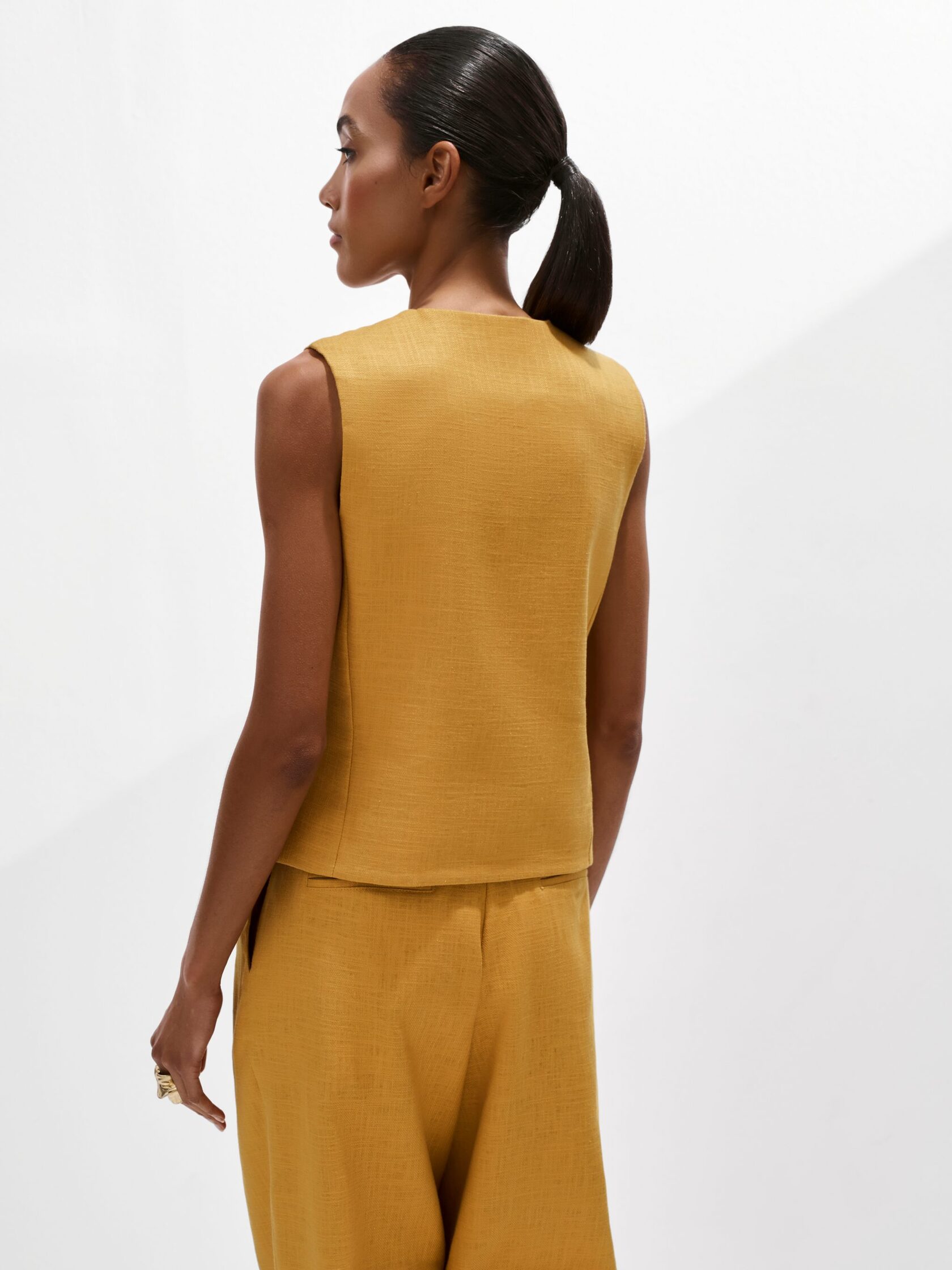 Прямой силуэт, аккуратный вырез и классическая пройма делают этот жилет одной из лучших покупок для лета, а роговые пуговицы подчеркивают природную фактуру материала.