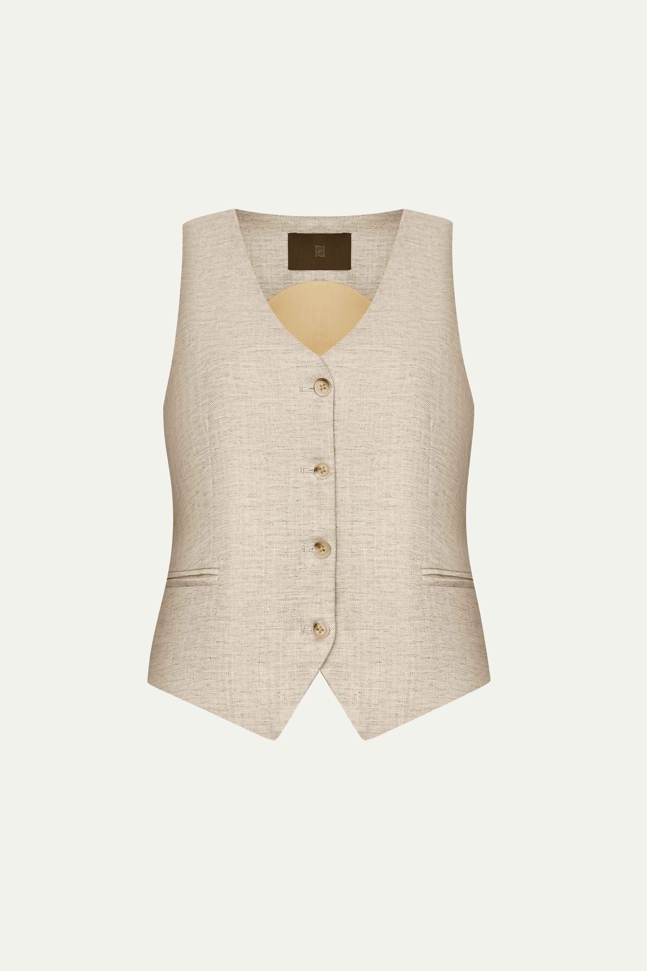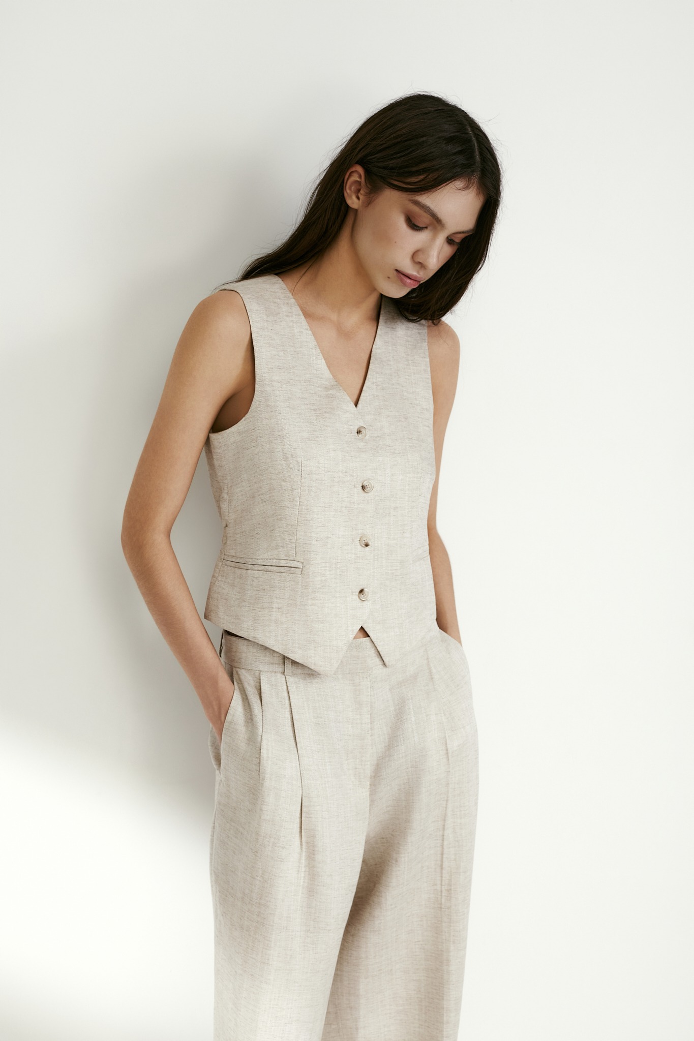 Название жилета Priroda отсылает к натуральному цвету льна — ставшему культовым в коллекции ROSI оттенку экрю, иными словами, мягкому серо-бежевому тону.