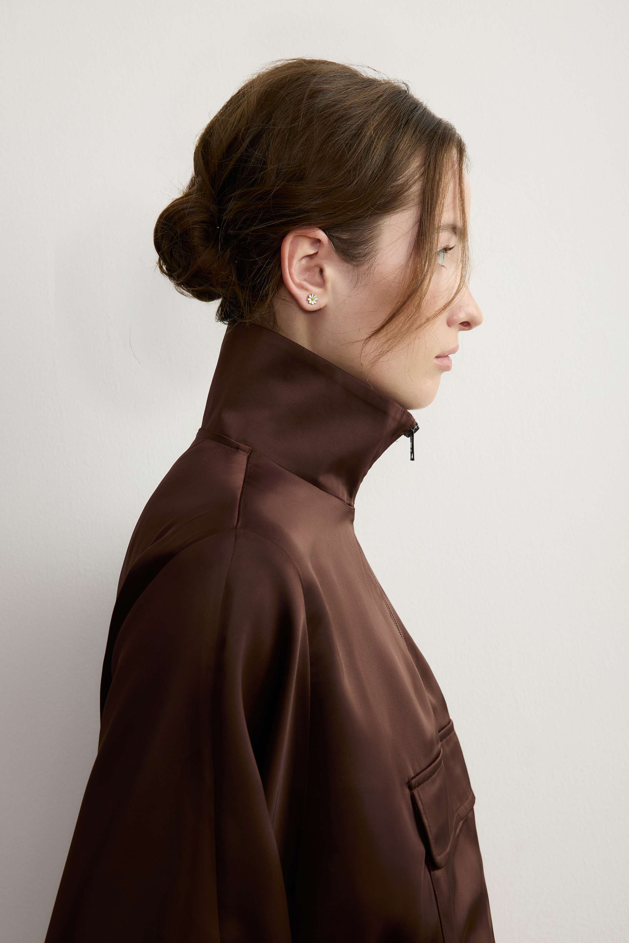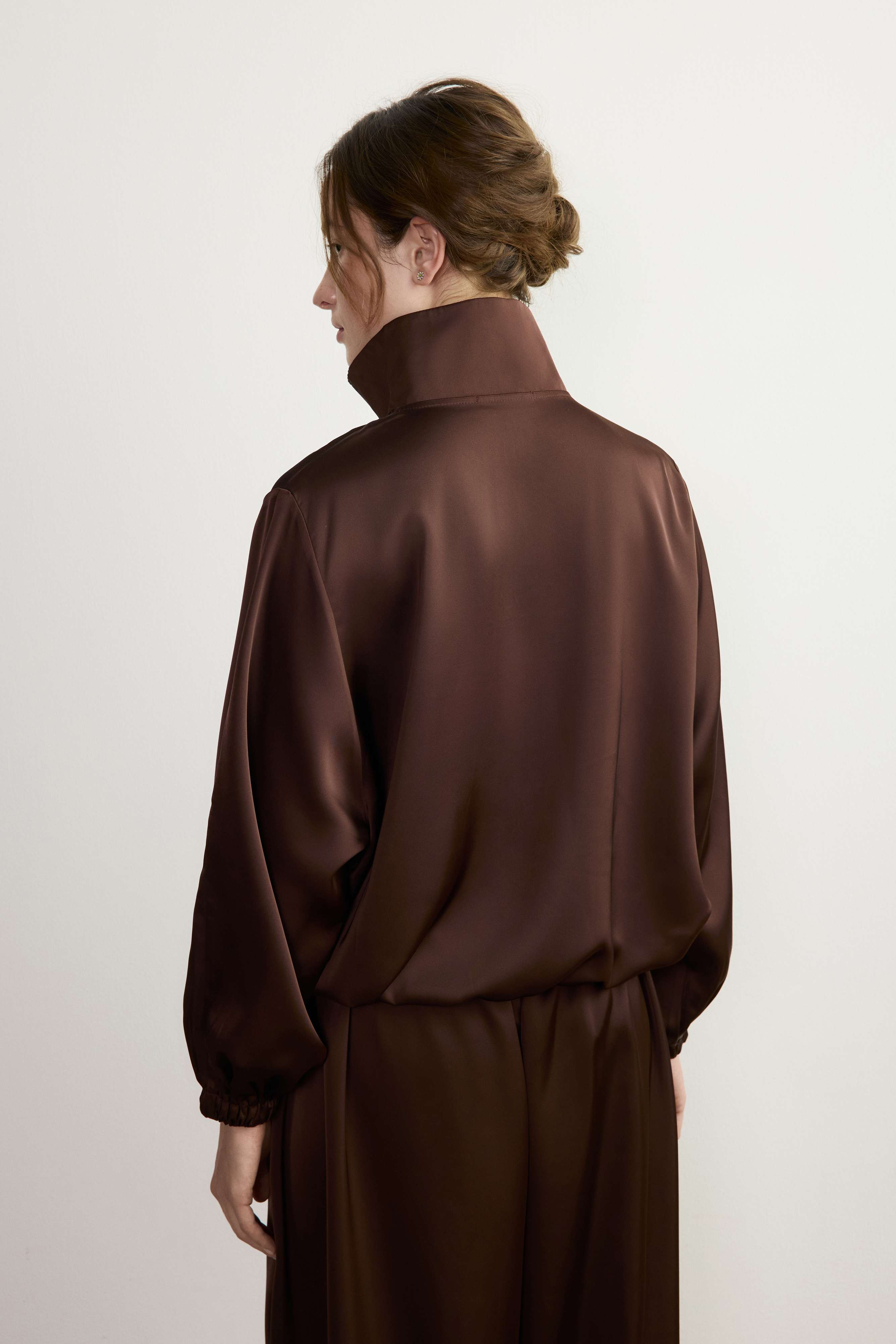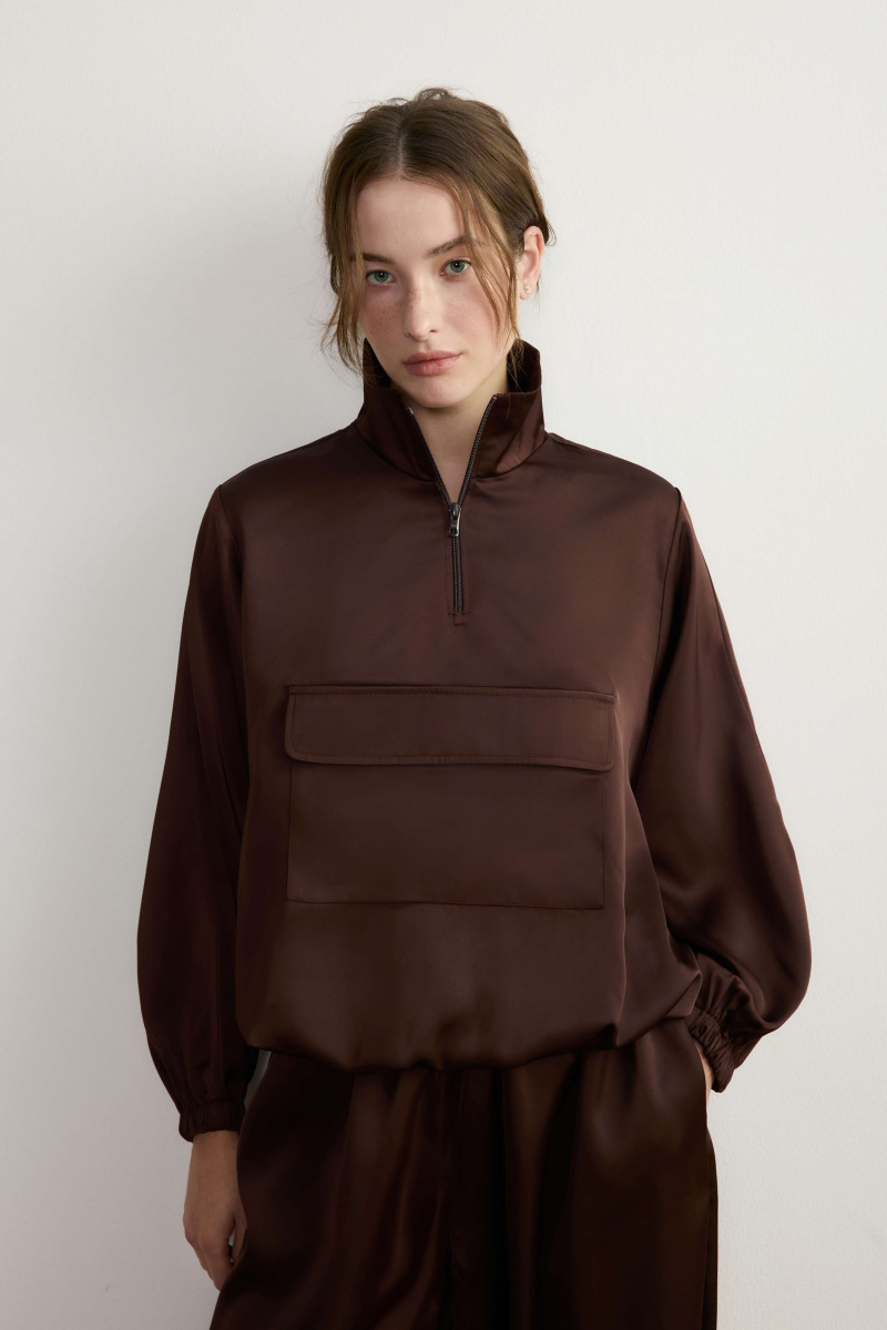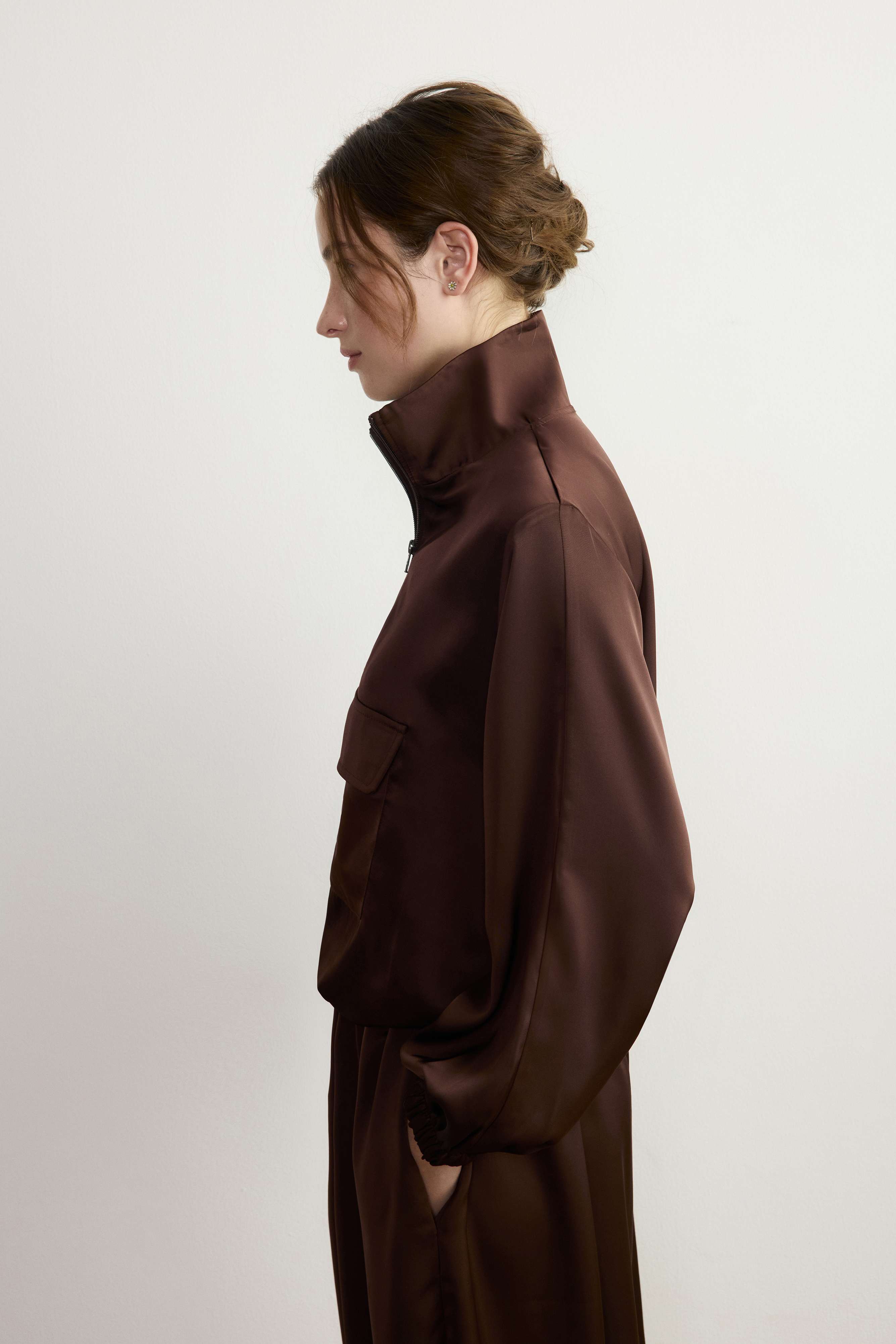 Анорак с воротником-стойкой на молнии — для осенних образов в эстетике athleisure: в нем мы объединили удобство и практичность спортивного стиля с расслабленной небрежностью кэжуала. Эластичная резинка на манжетах и по низу изделия подчеркивает свободный силуэт, а вместительный накладной карман позволяет держать все необходимое под рукой и обходиться без сумки. Насыщенный цвет горького шоколада оттеняет плотный атлас, делая более заметным каждый перелив шелковистого материала.