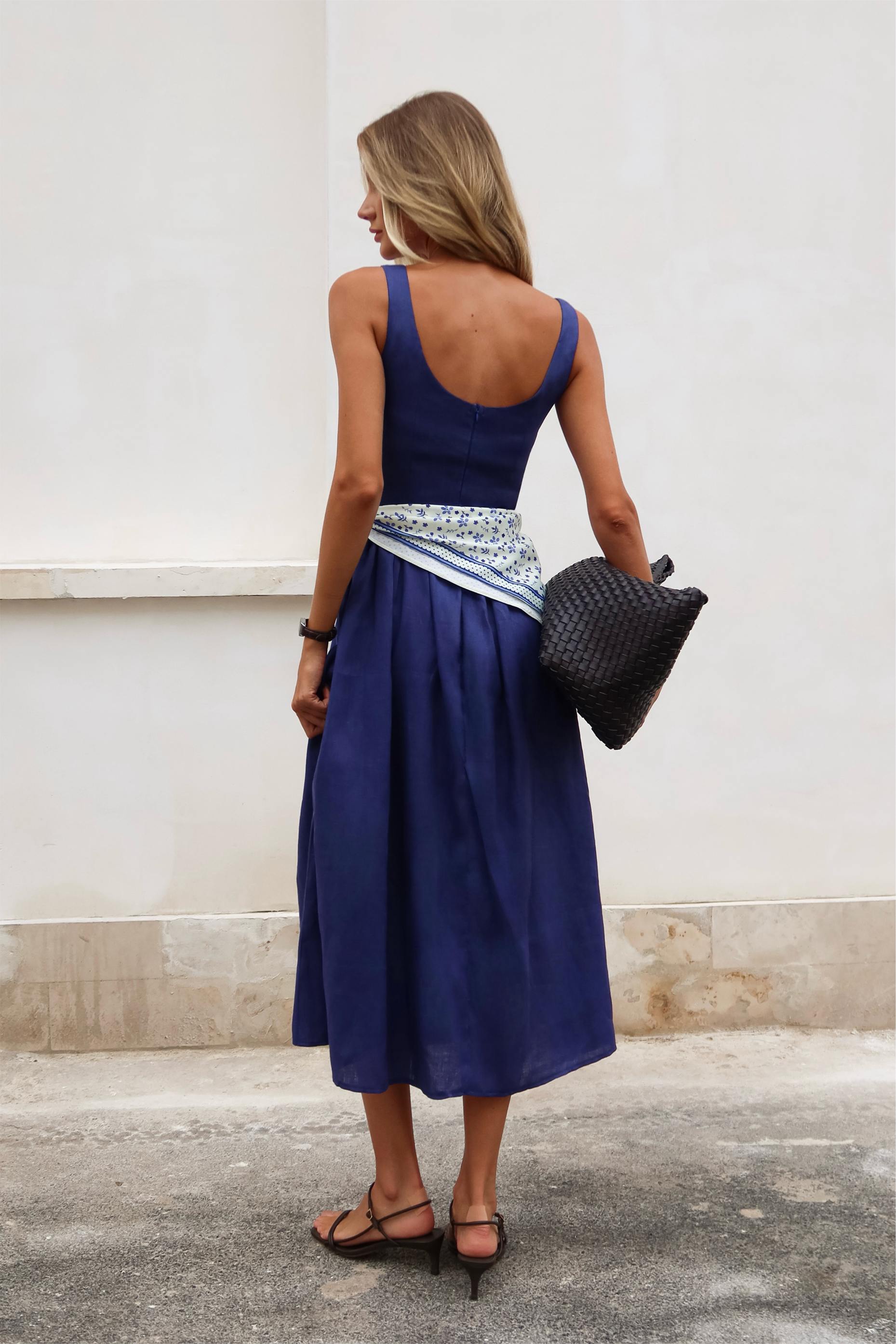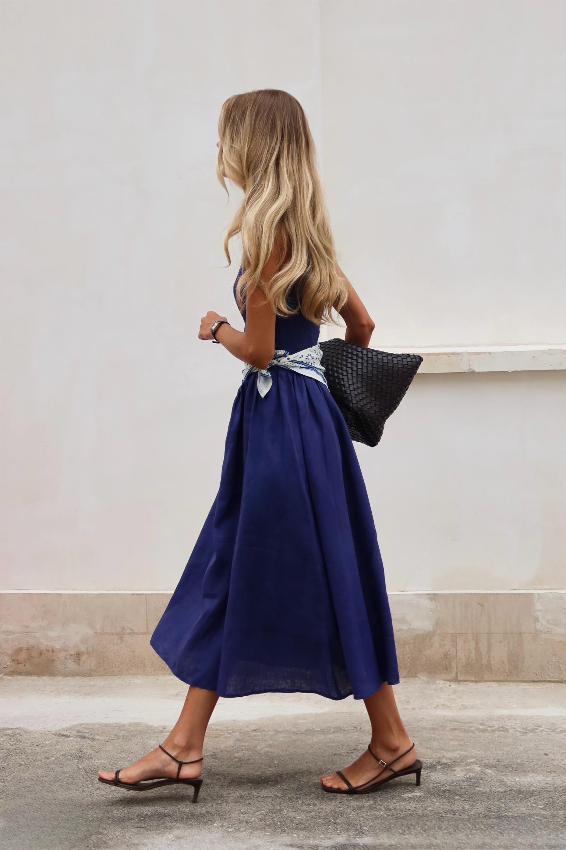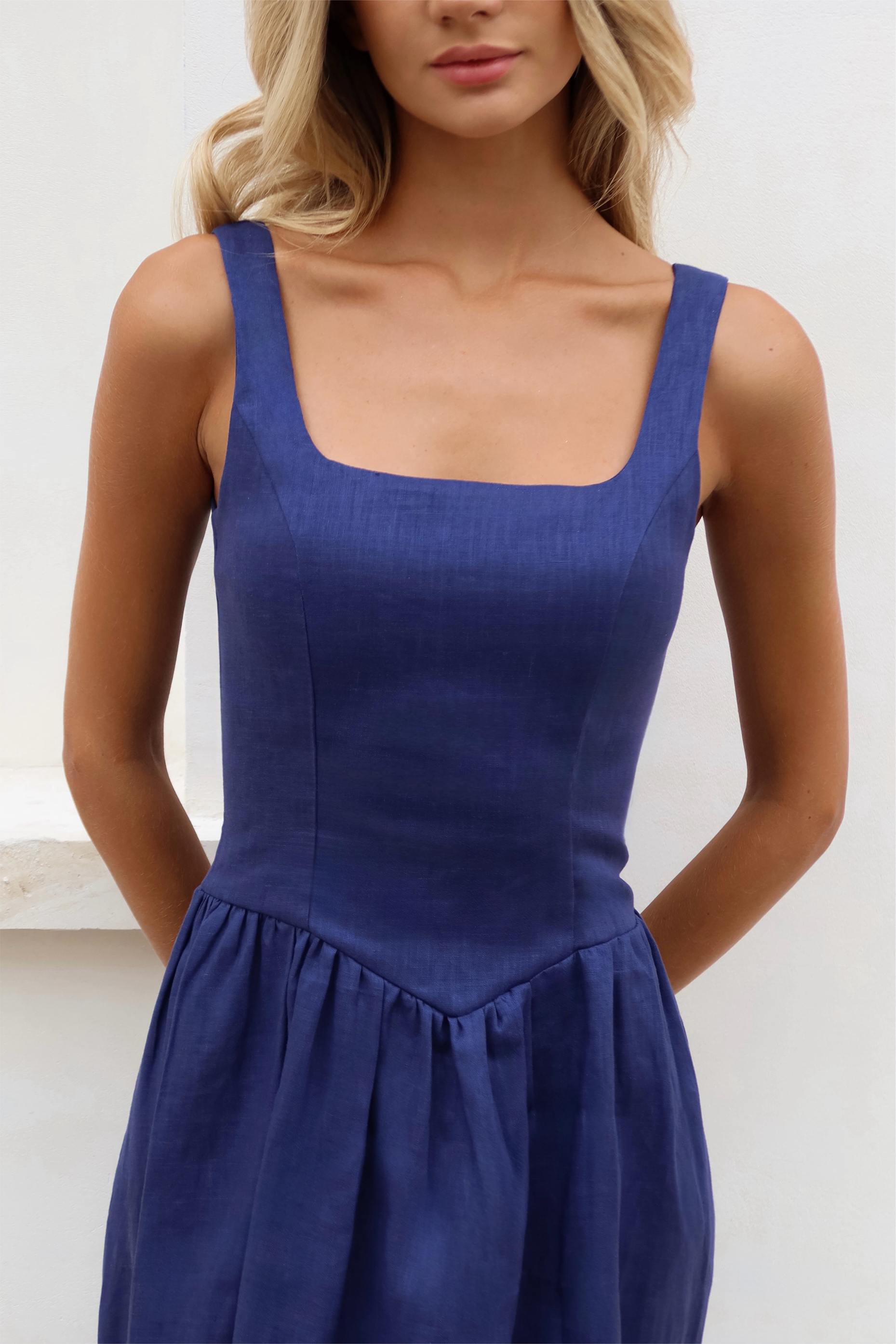 В этом платье длины миди нашла воплощение самая женственная эстетика — balletcore. К стилю балерин отсылают вырез каре, прилегающий корсетный крой и юбка-полусолнце, а также линия талии с V-образным углублением — она позволяет изящно подчеркнуть и визуально вытянуть силуэт. Выполнено из легкого и воздушного льна в двух насыщенных оттенках — индиго и шоколадном.