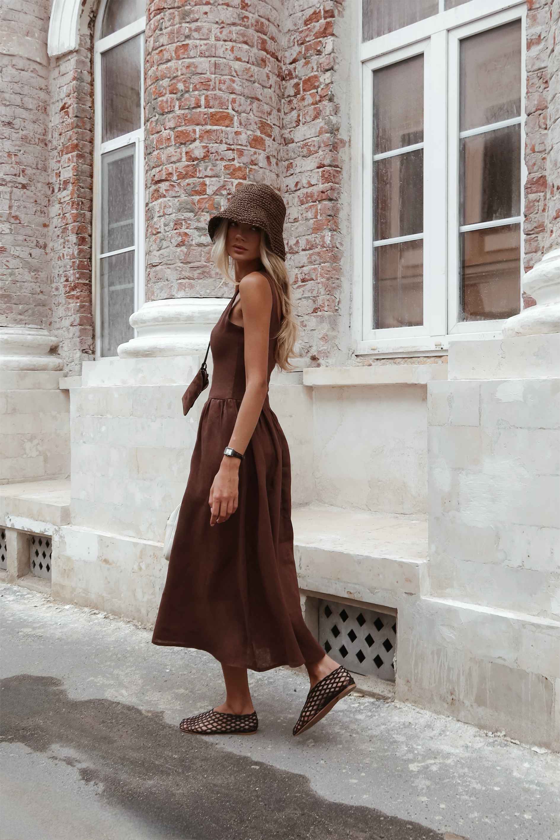 В этом платье длины миди нашла воплощение самая женственная эстетика — balletcore. К стилю балерин отсылают вырез каре, прилегающий корсетный крой и юбка-полусолнце, а также линия талии с V-образным углублением — она позволяет изящно подчеркнуть и визуально вытянуть силуэт. Выполнено из легкого и воздушного льна в двух насыщенных оттенках — индиго и шоколадном.