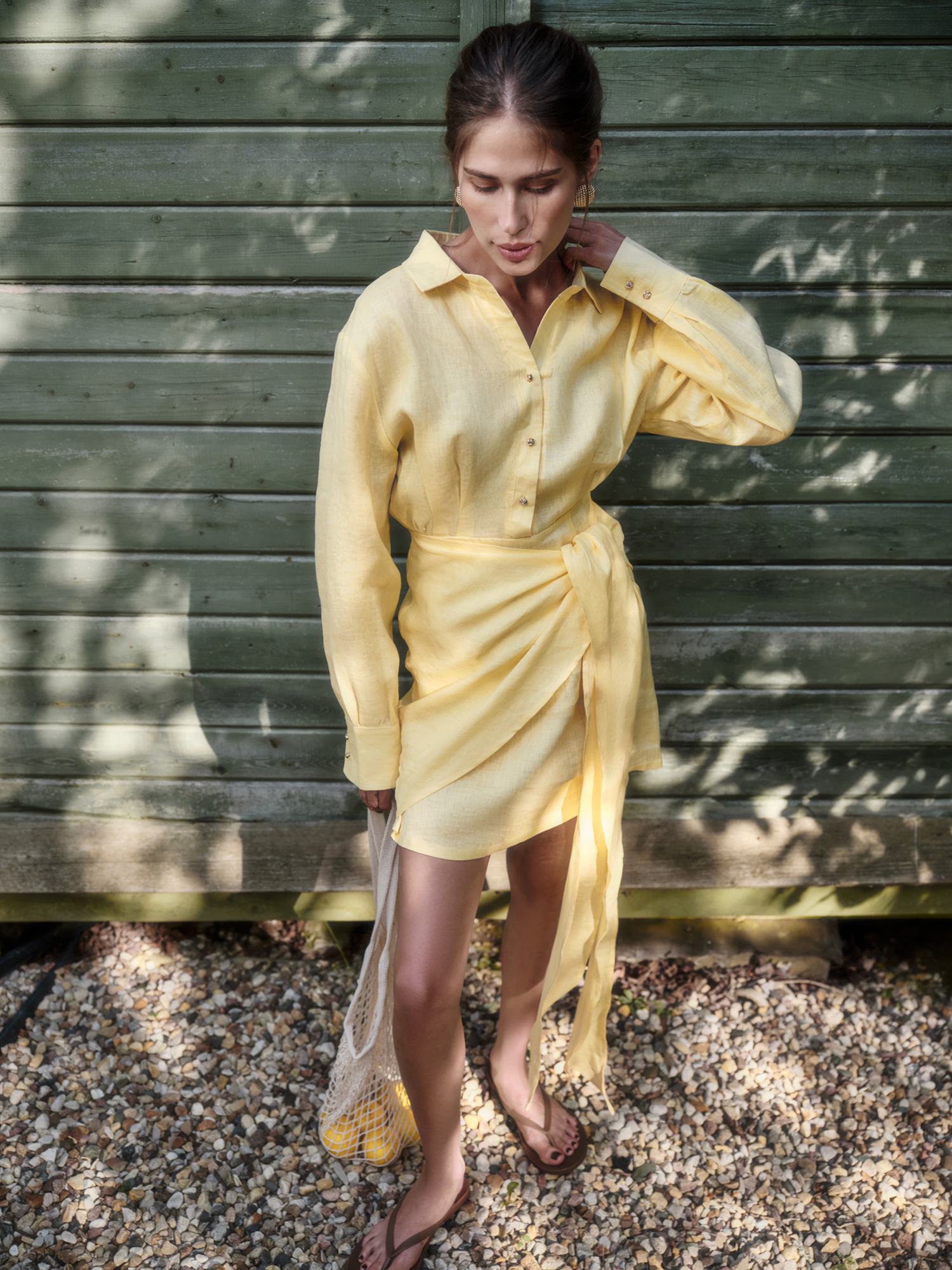 Новая интерпретация знакомого каждой платья-рубашки. Оно подойдет для встреч на веранде и свиданий с городом, скрасит будни в офисе и выручит в особых случаях — приталенный крой с узлом на талии превращает базовую модель в акцентную, а спущенное плечо и удлиненные манжеты создают хрупкий и утонченный силуэт. Выполнено изо льна, прохладного на ощупь и полного воздуха, в двух актуальных оттенках — лимонный сорбет и клубника со сливками.