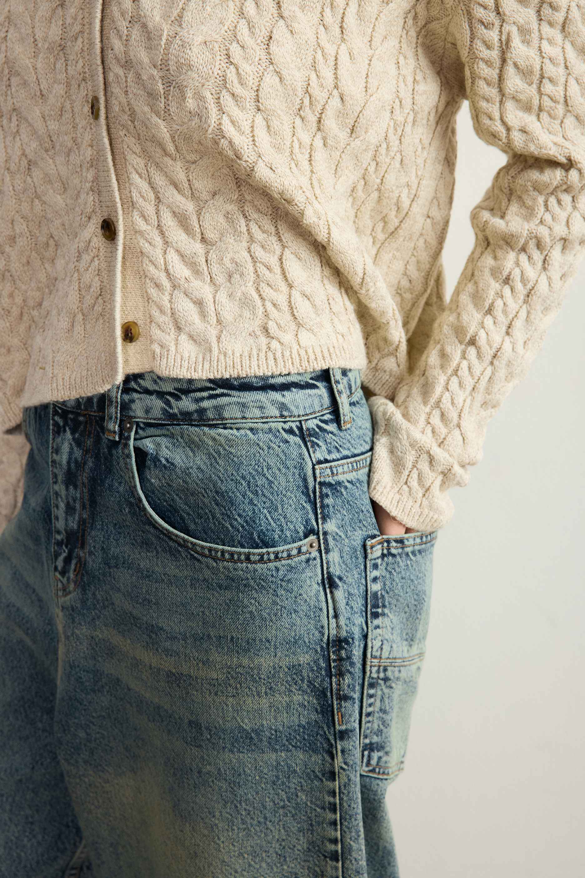 Новинка выполнена из плотного хлопкового денима с эффектом делаве, иными словами, с винтажной варкой и потертостями.