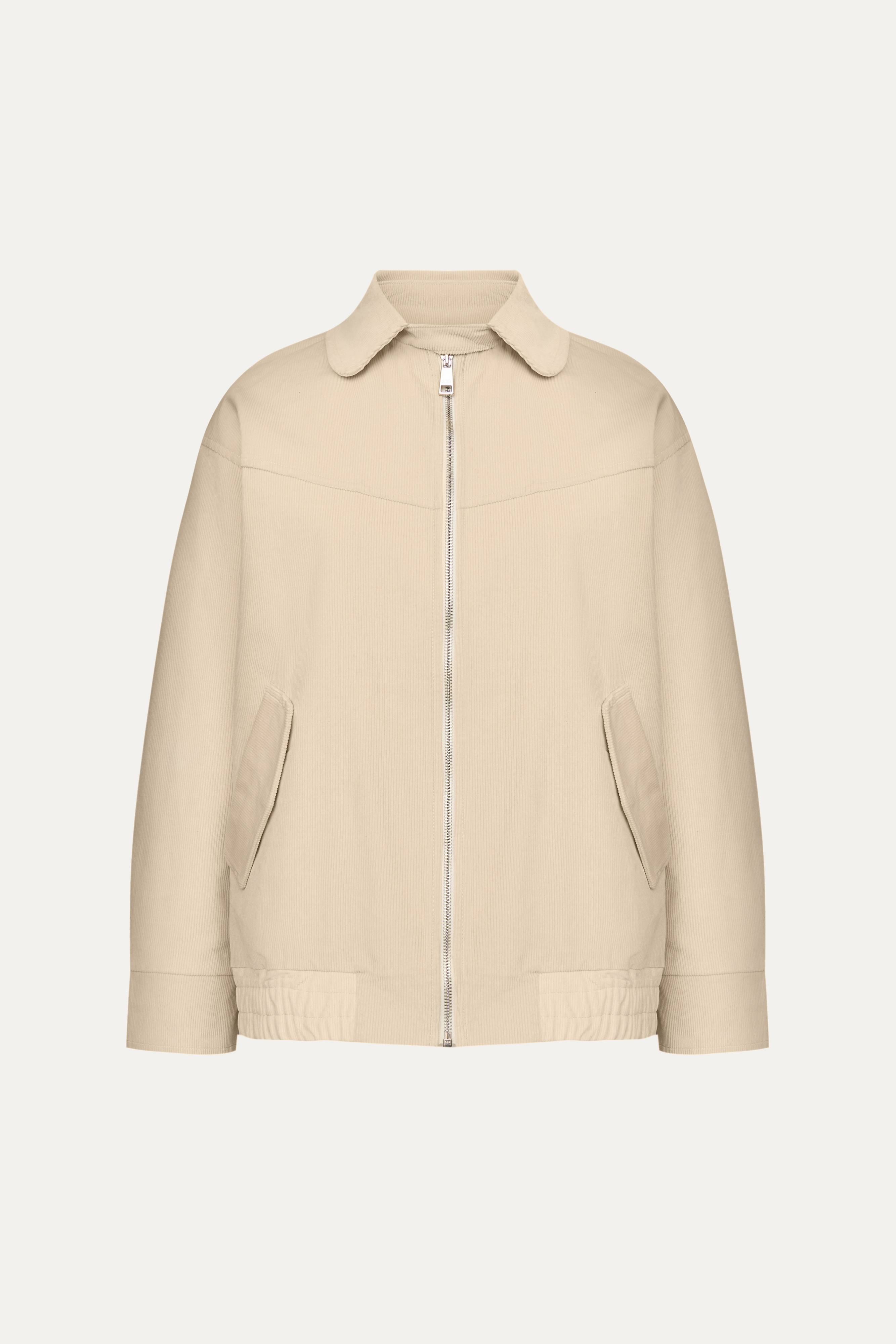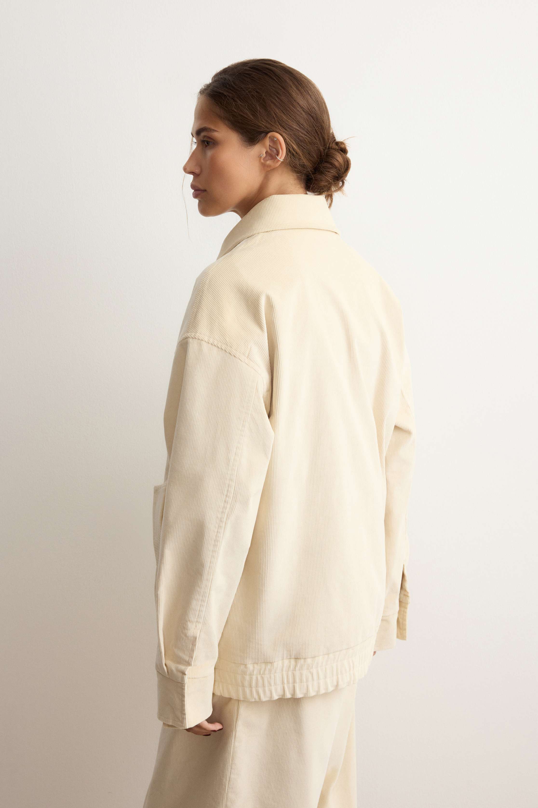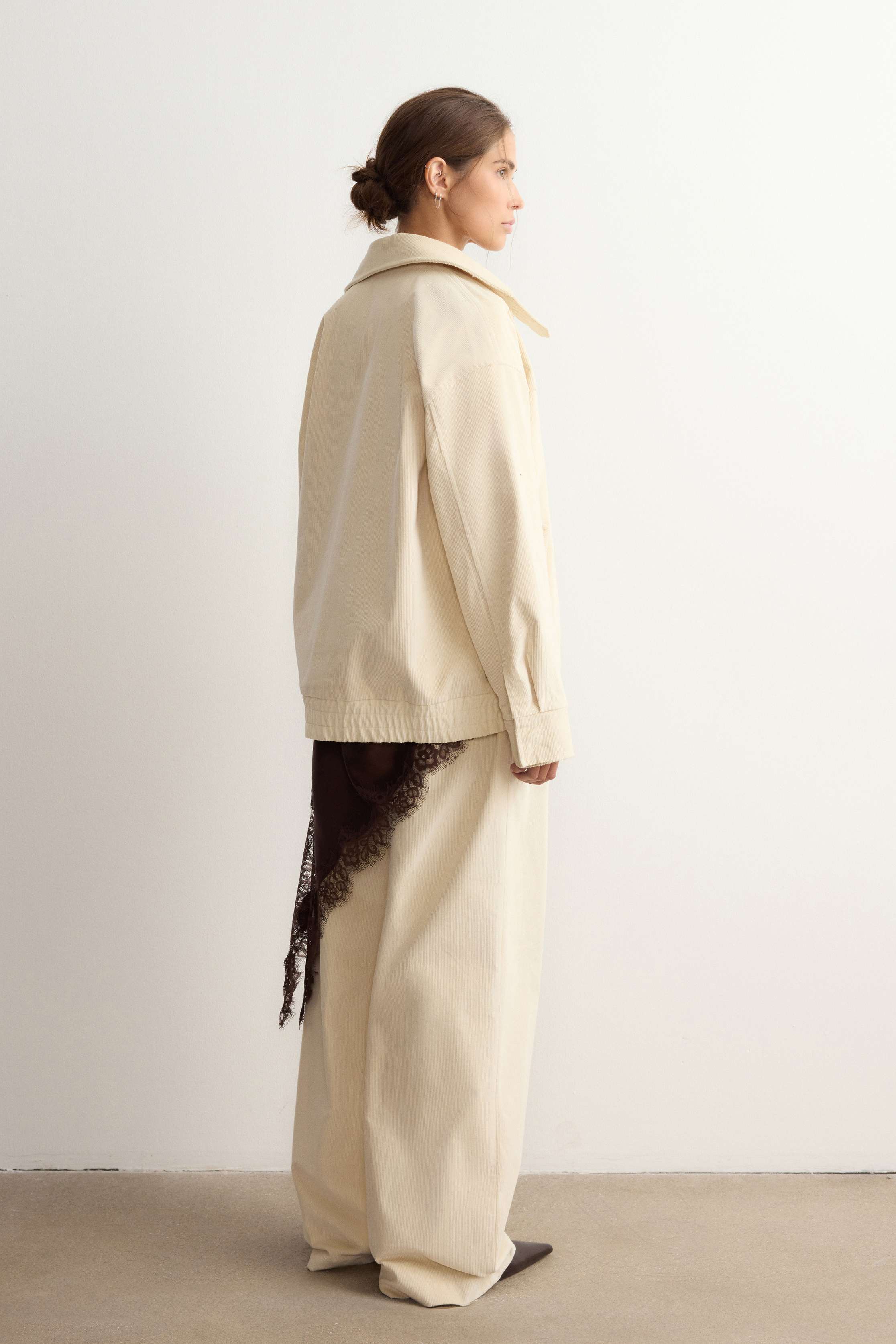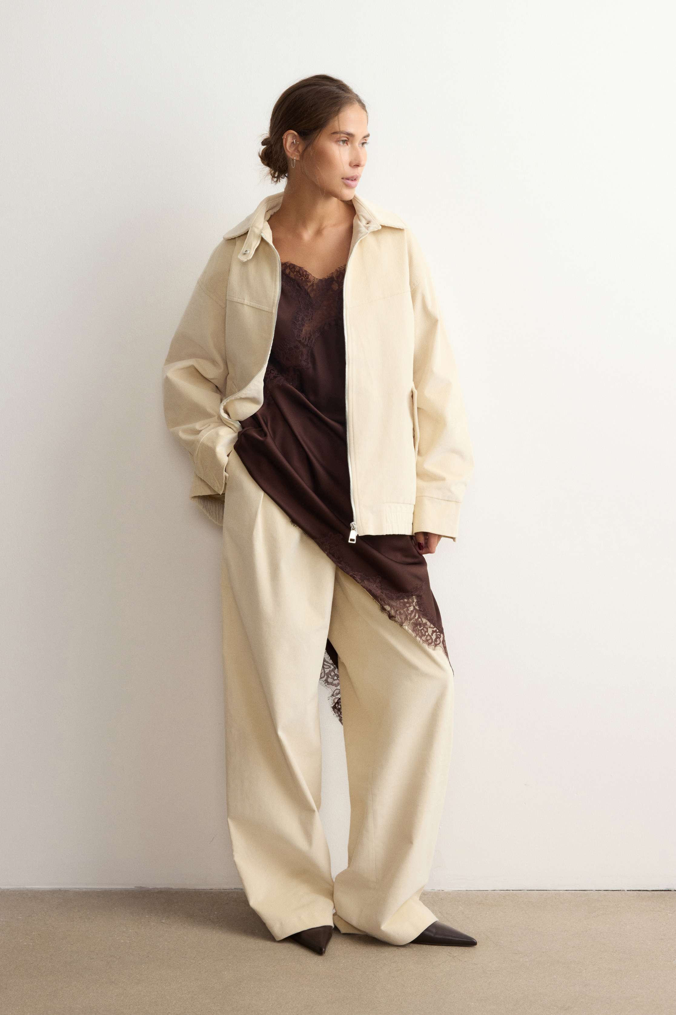 С одной стороны, в модели прослеживаются черты бомбера — оверсайз-силуэт, застежка на молнию, резинка на поясе. С другой, дерзкий характер смягчен отложным воротником и оттенком айвори, подчеркивающим благородную фактуру материала.