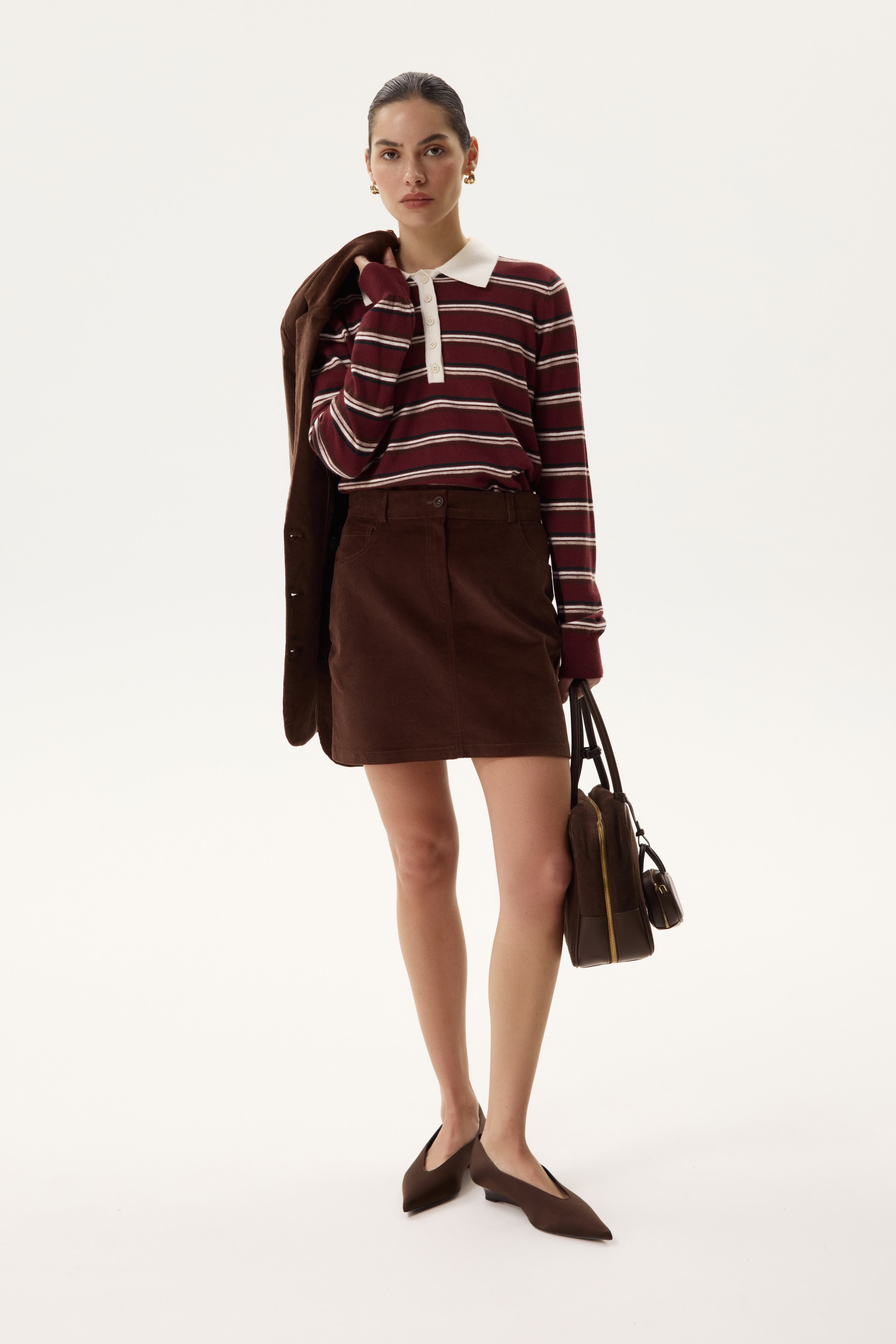 Новинка выполнена из хлопкового вельвета, созданного в Италии, — плотного и мягкого материала в мелкий рубчик. Фактуру материала подчеркивает насыщенный оттенок горького шоколада.
