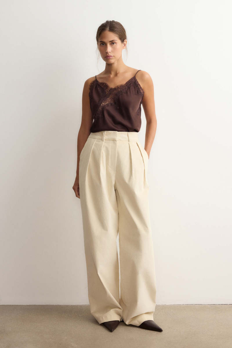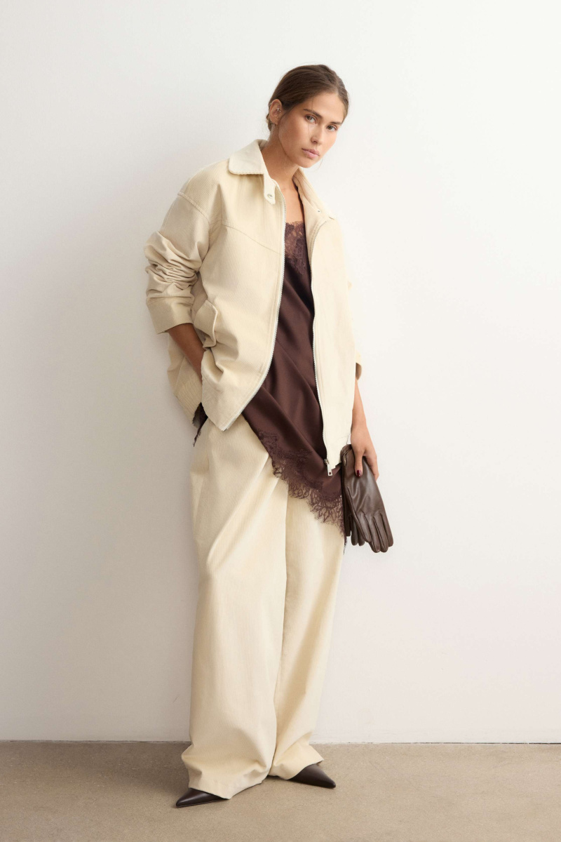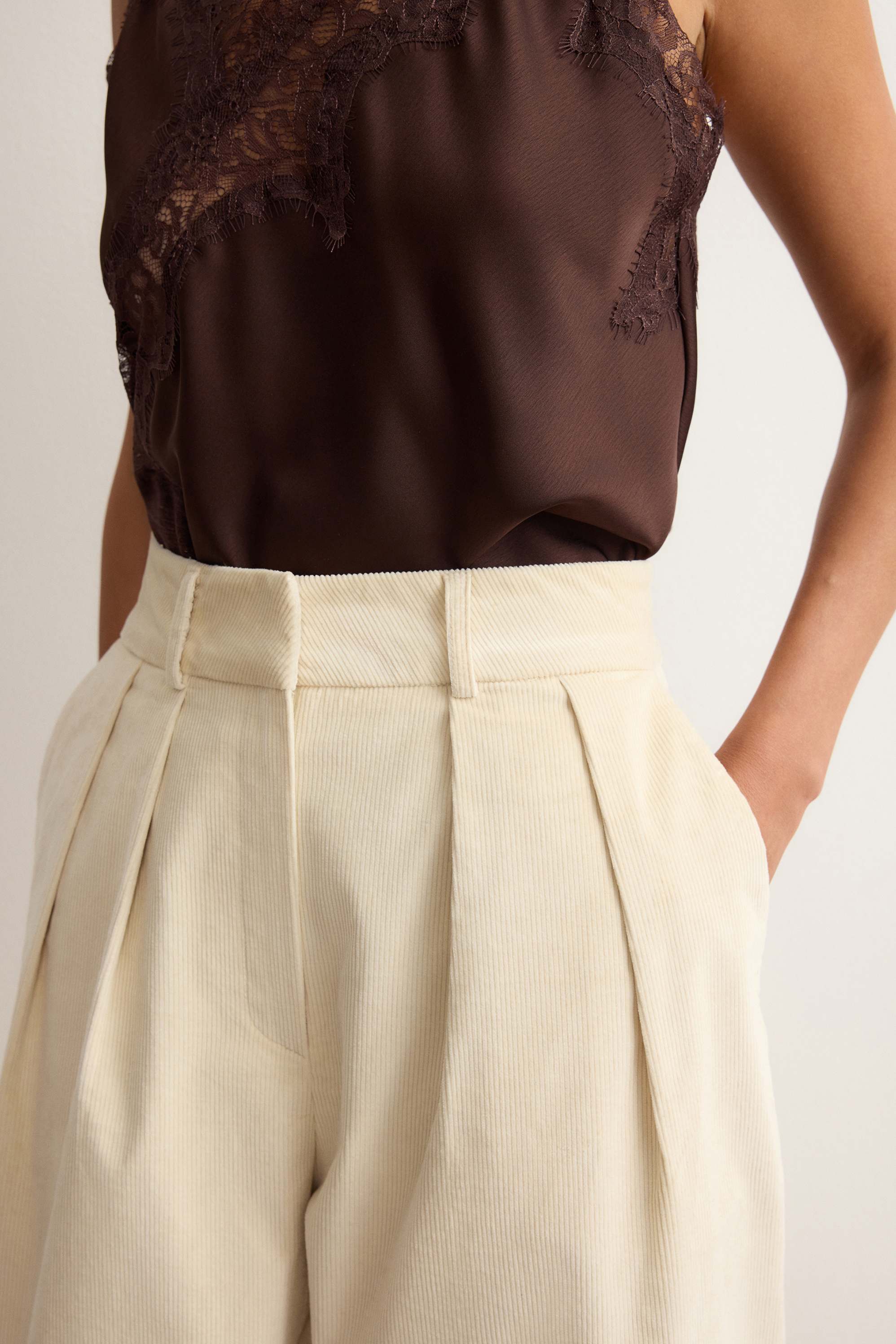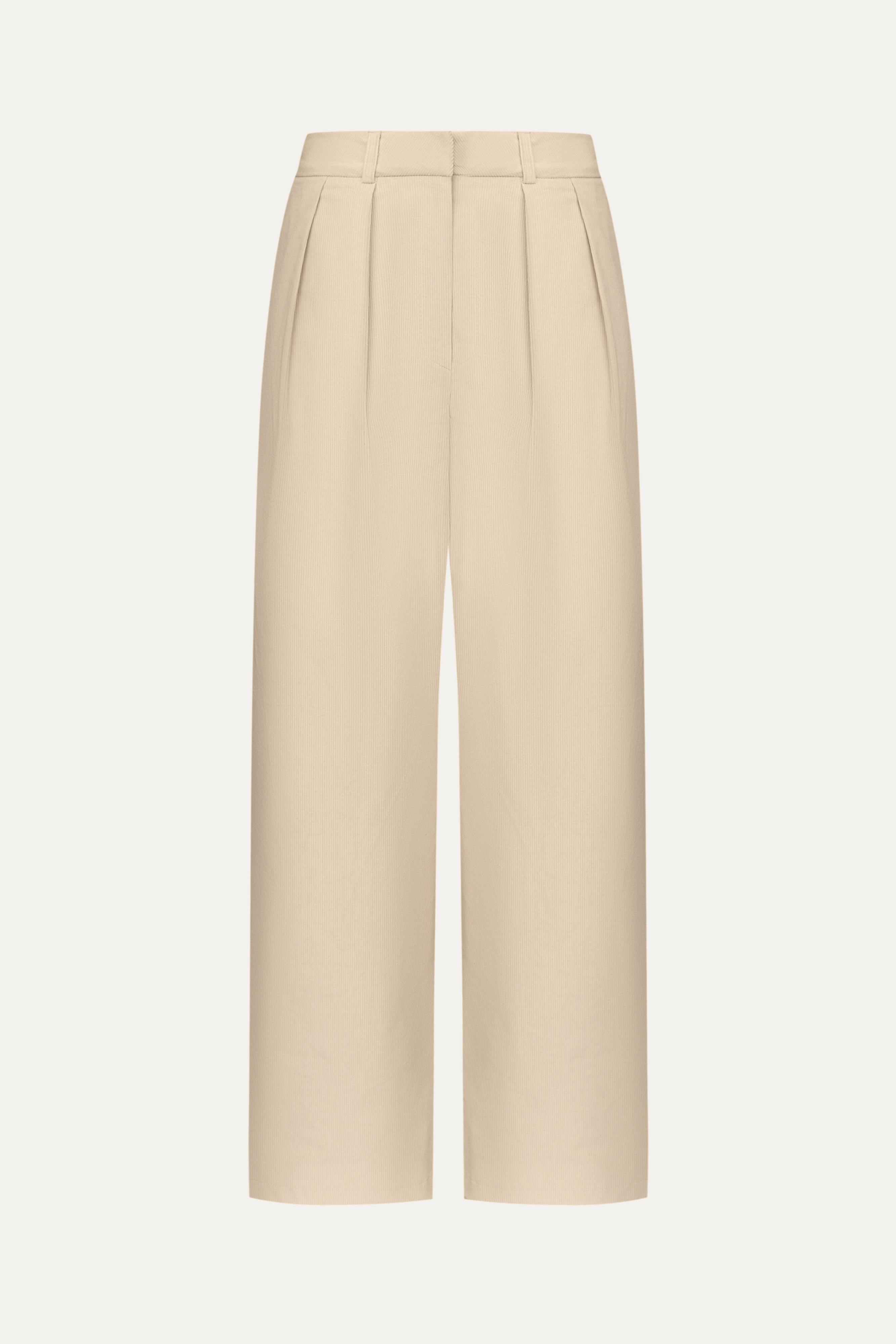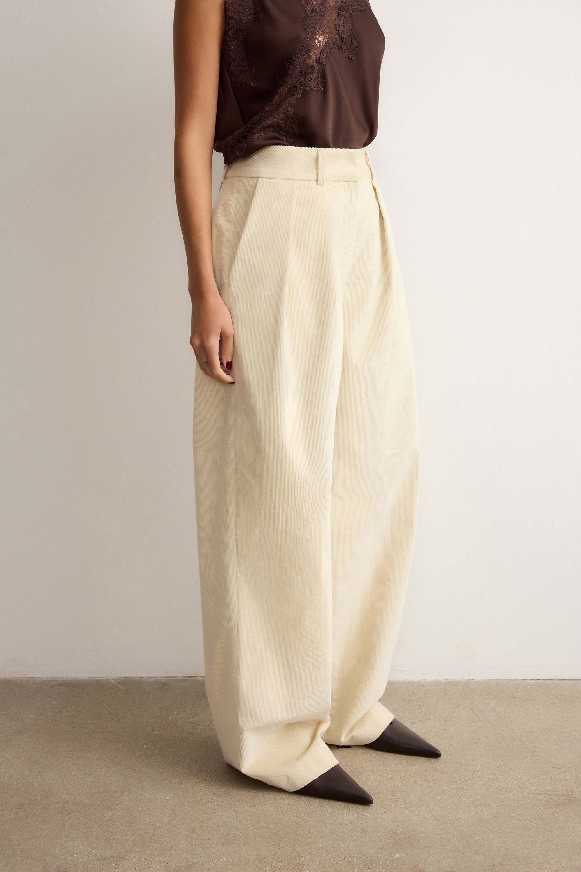 Брюки из мягкого вельвета в мелкий рубчик привнесут в осень уют, а в образы — игру материалов и фактур. Вельвет для них мы нашли на выставке итальянских производителей тканей: он плотный, но в то же время легкий и бархатистый на ощупь. Благодаря защипам от пояса и свободному крою брюки подчеркнут хрупкость и женственность силуэта. Для большего акцента на талии добавьте ремень — у этой пары есть шлевки.