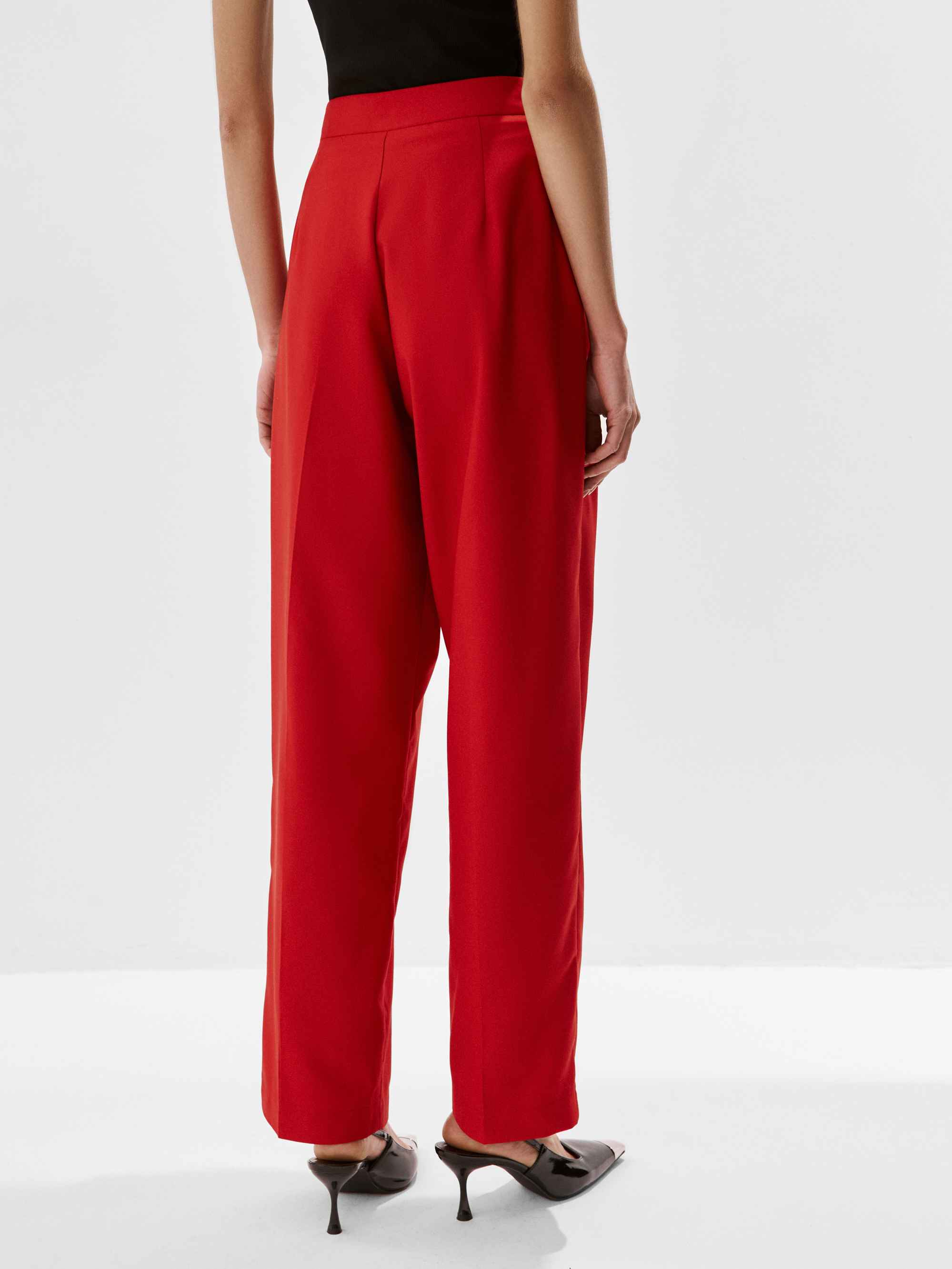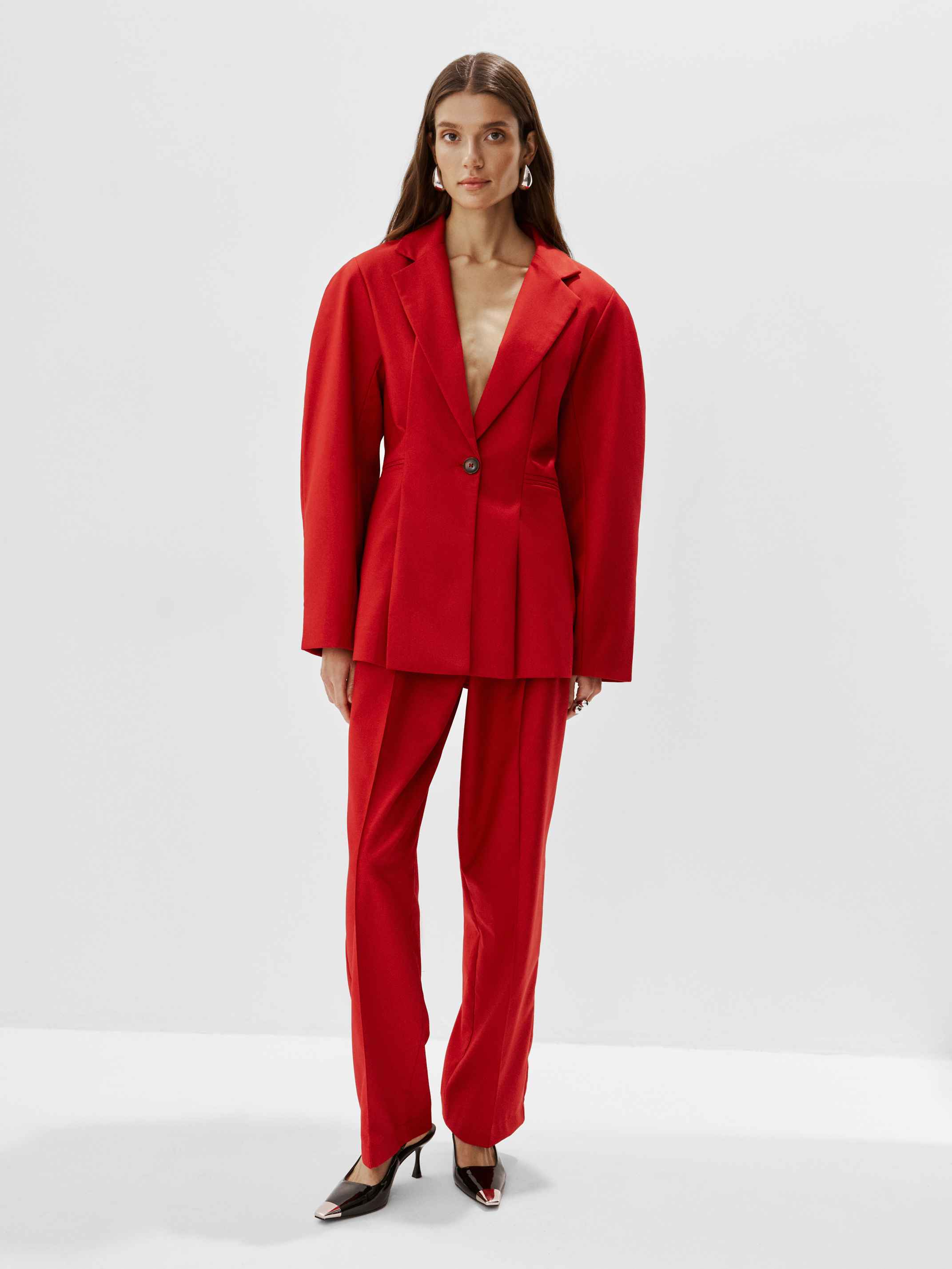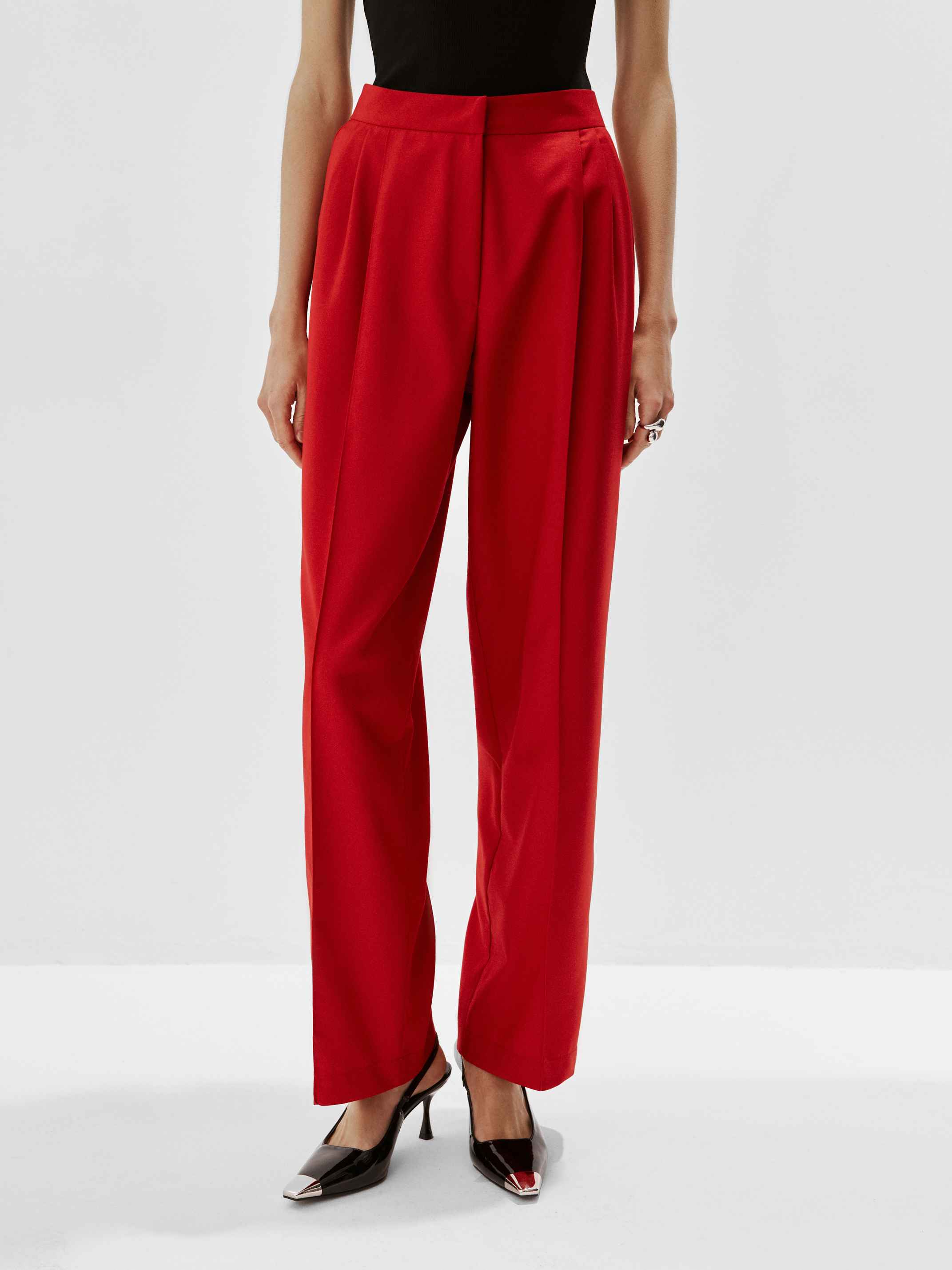 Прямые строгие брюки со стрелками и складками от пояса — неотъемлемая часть костюма-двойки из нашей коллекции.