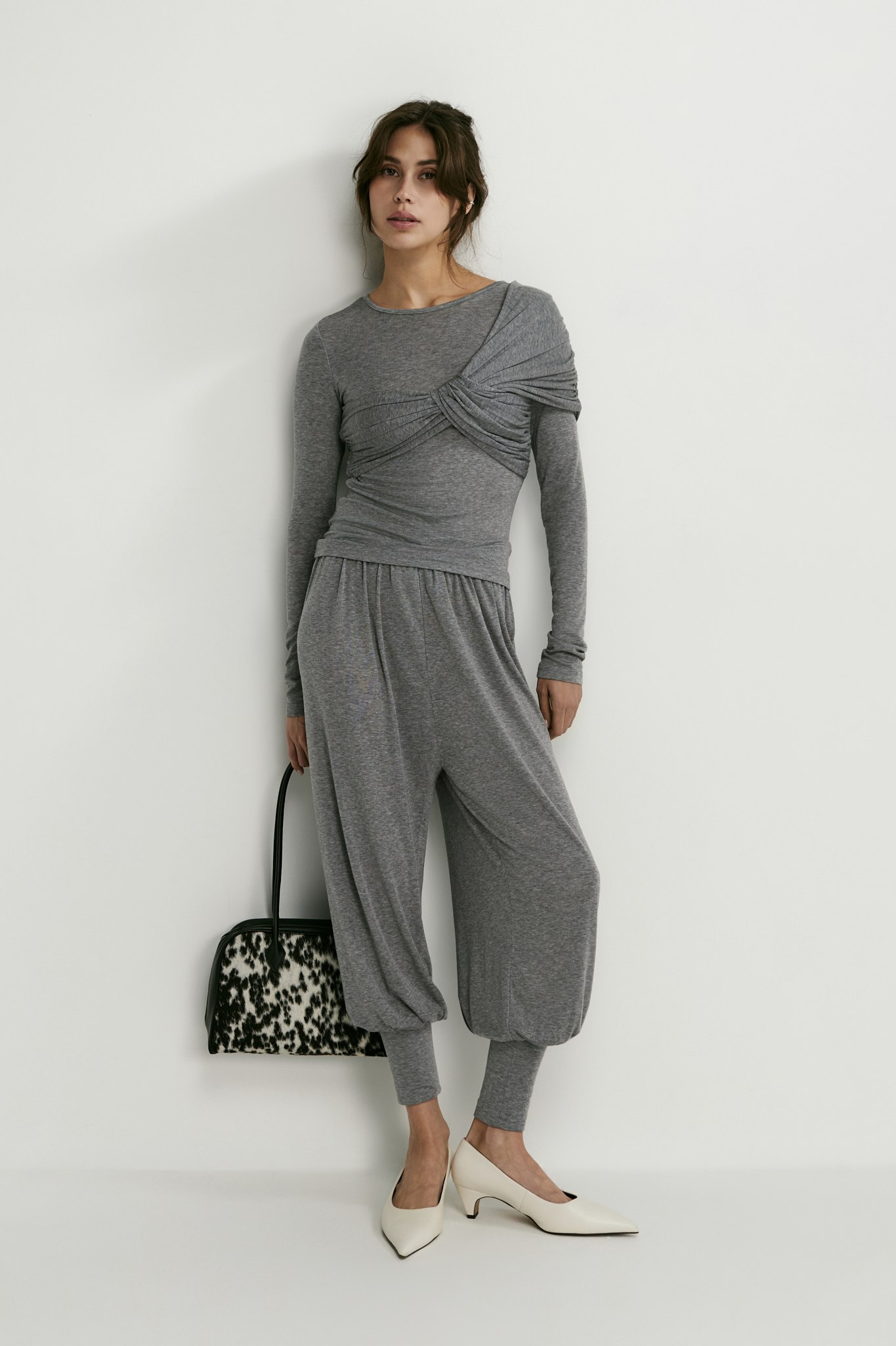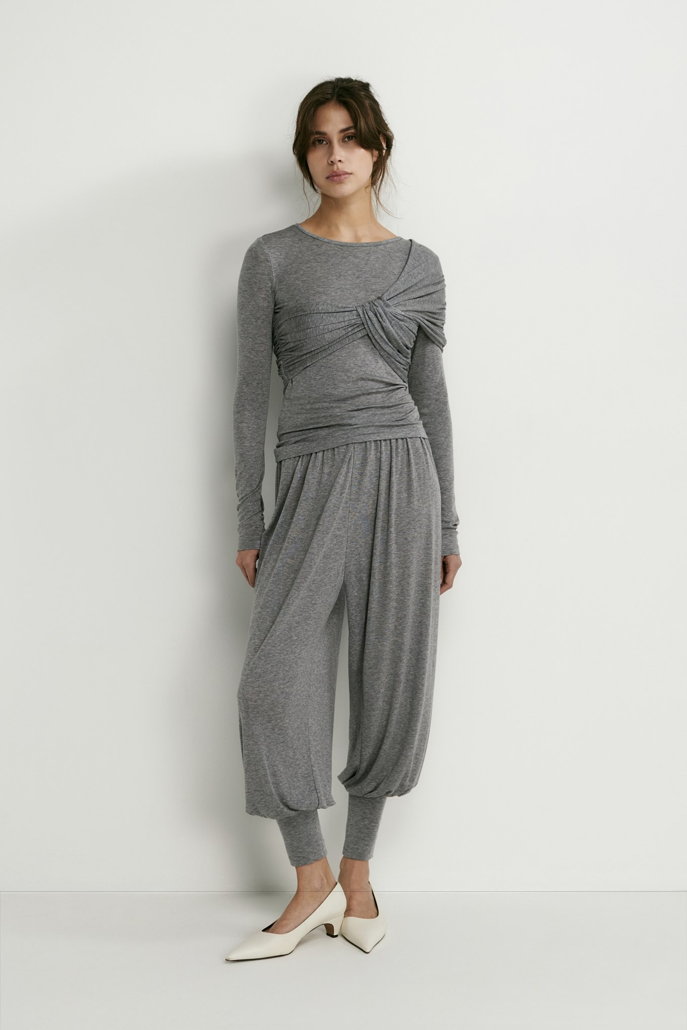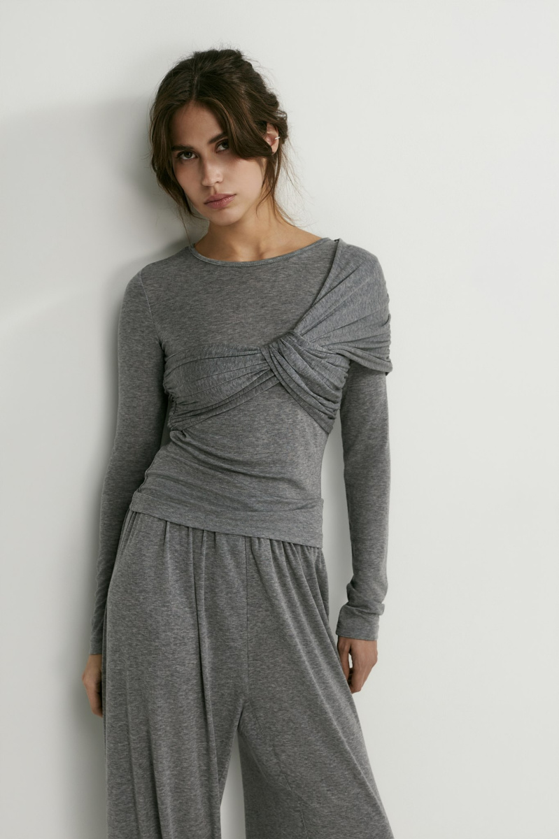 Лонгслив с аккуратным круглым вырезом идеален не только в качестве нижнего слоя под жакет — перекрут на груди превращает его в самостоятельный верх и делает изящным акцентом в образе.