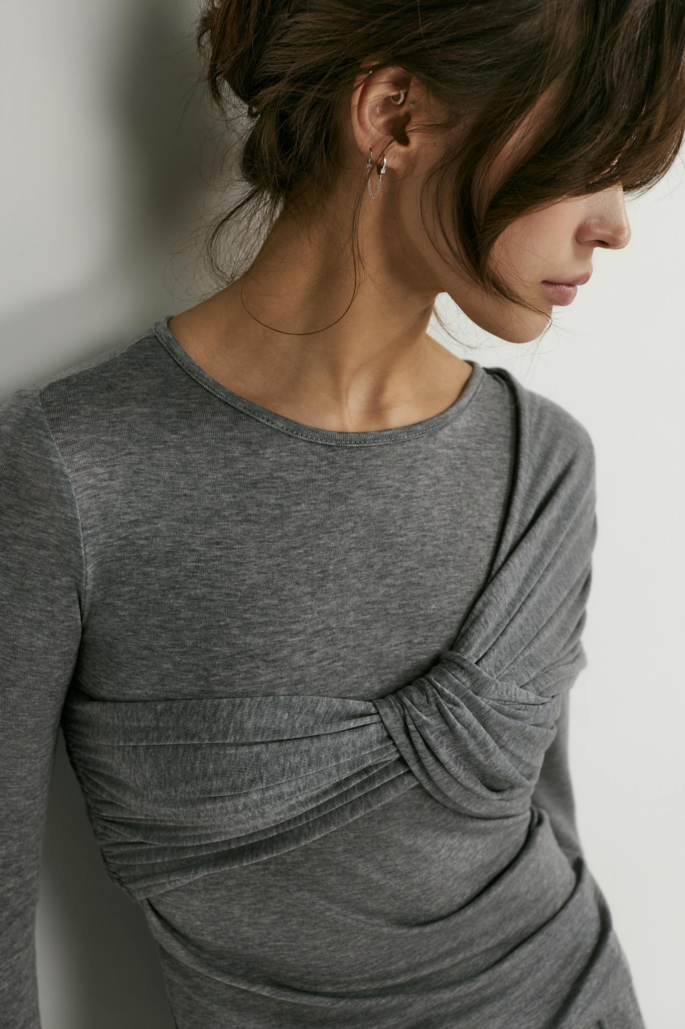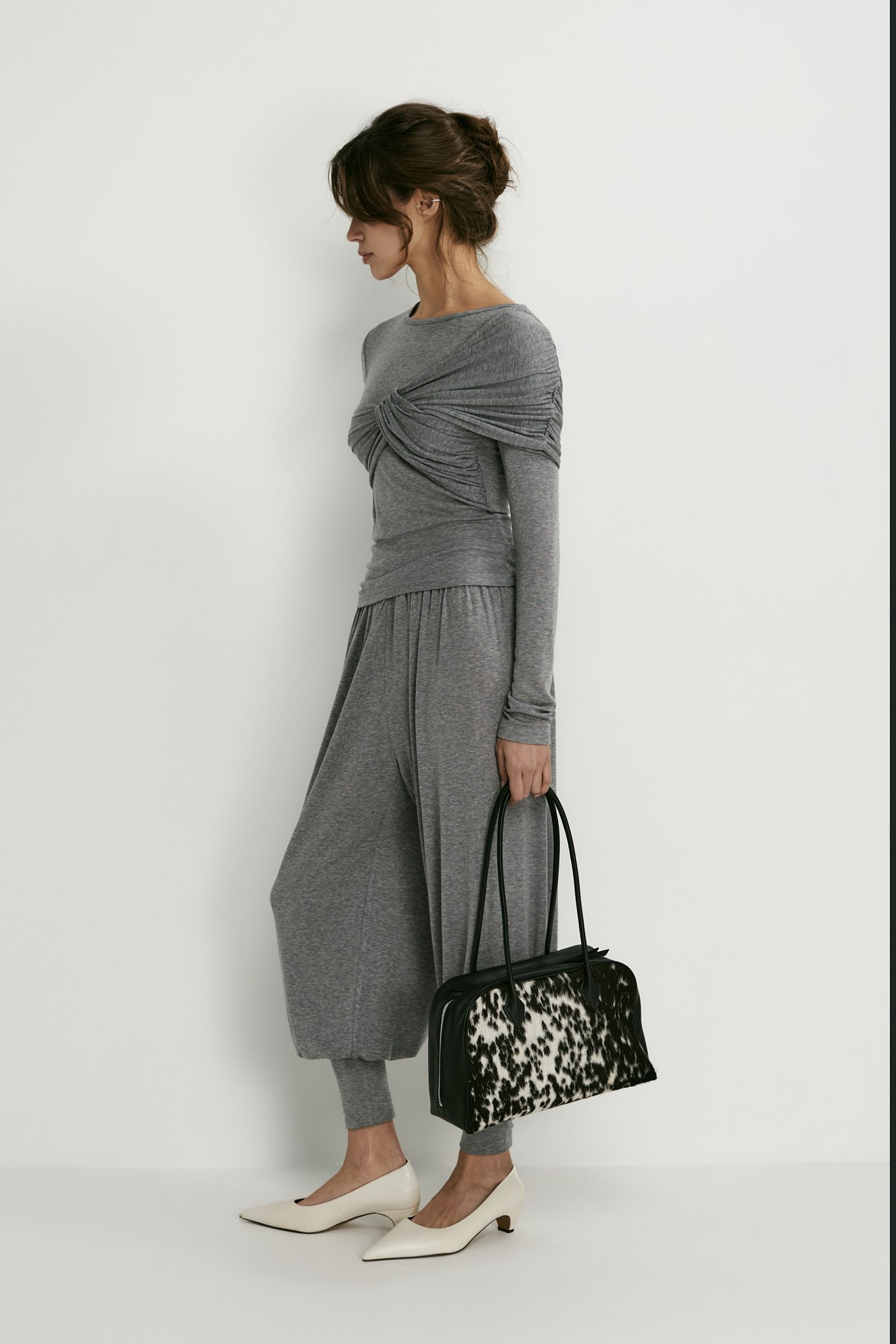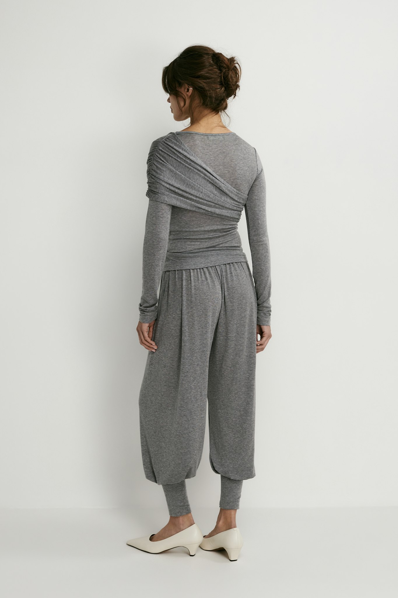 Лонгслив с аккуратным круглым вырезом идеален не только в качестве нижнего слоя под жакет — перекрут на груди превращает его в самостоятельный верх и делает изящным акцентом в образе.