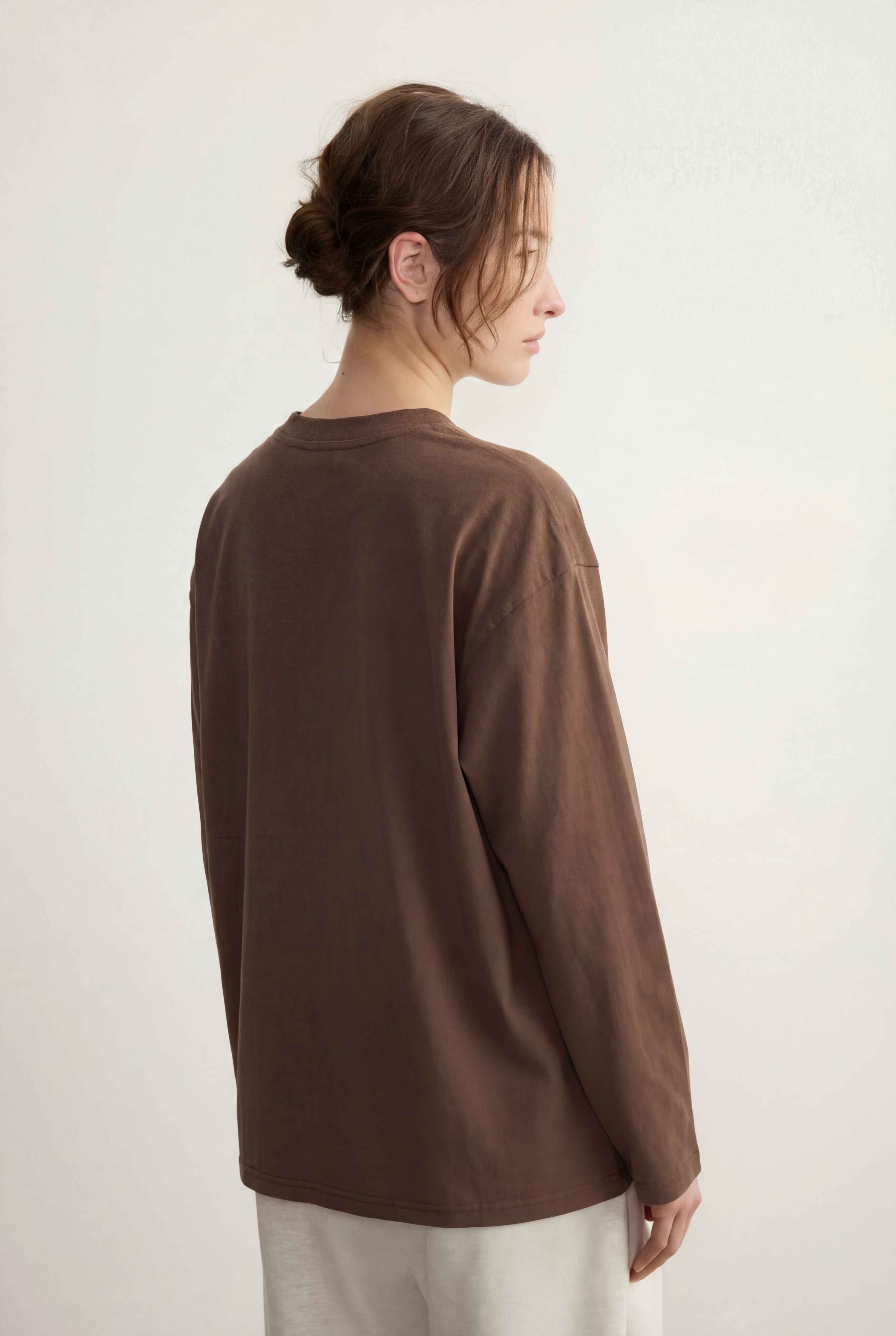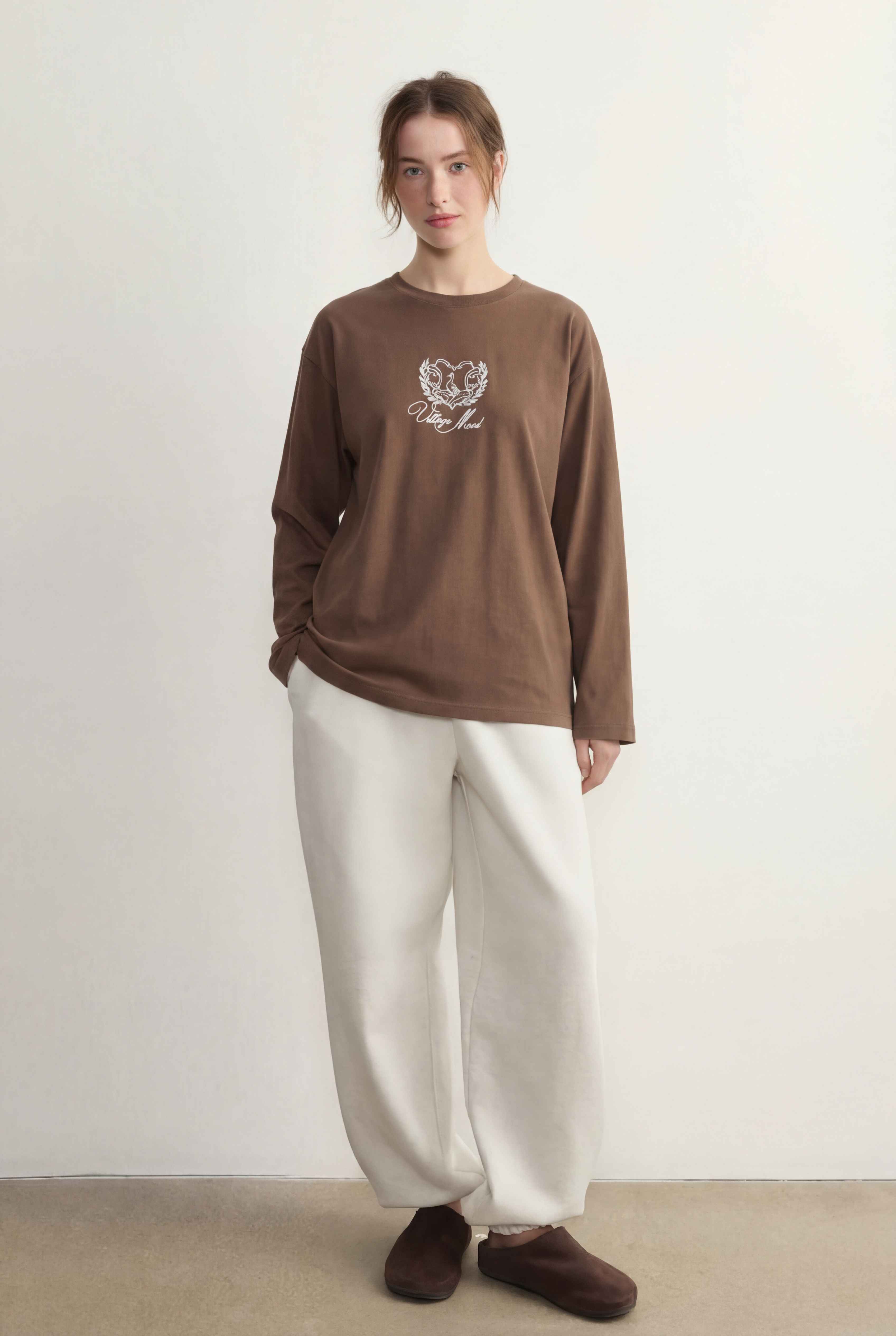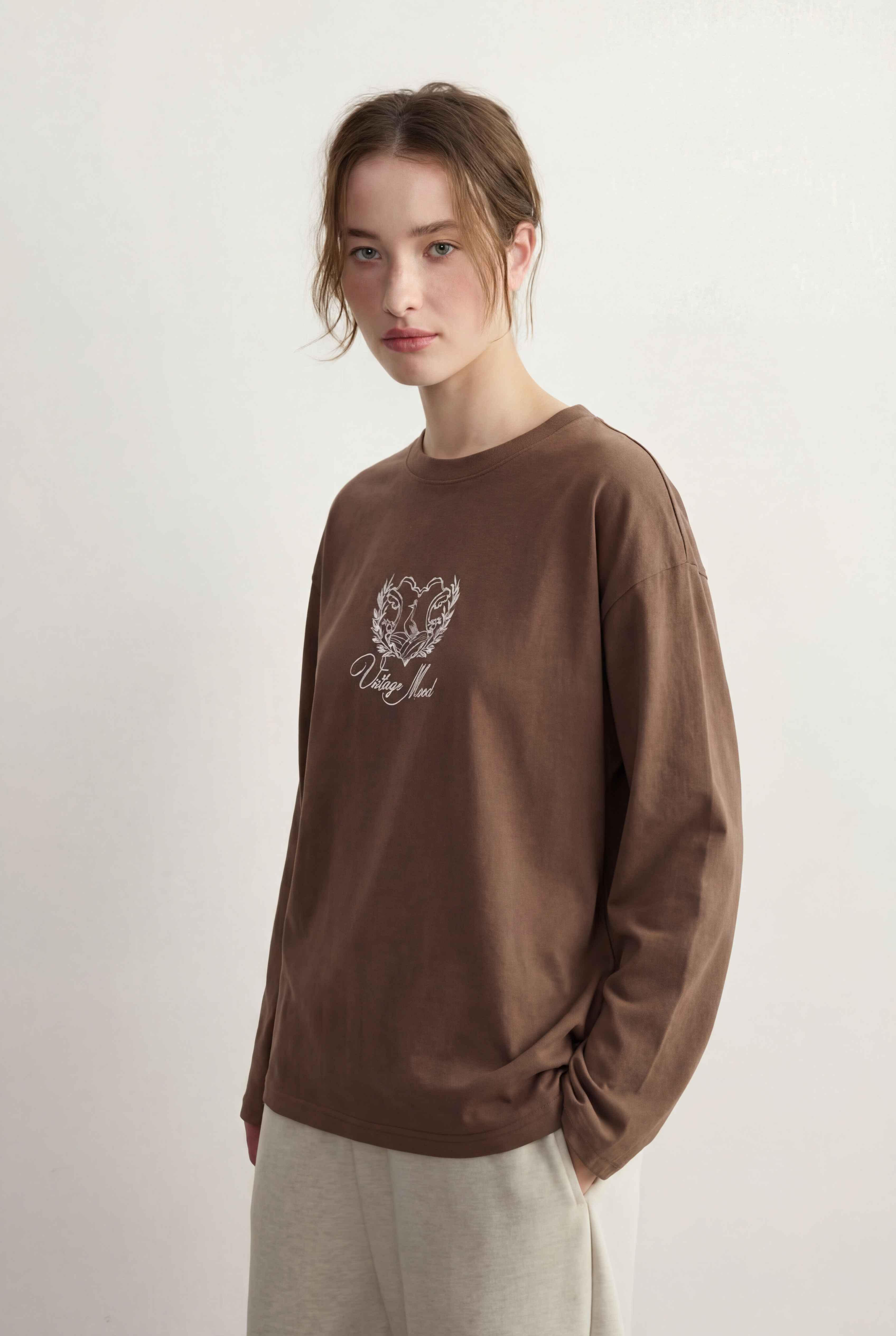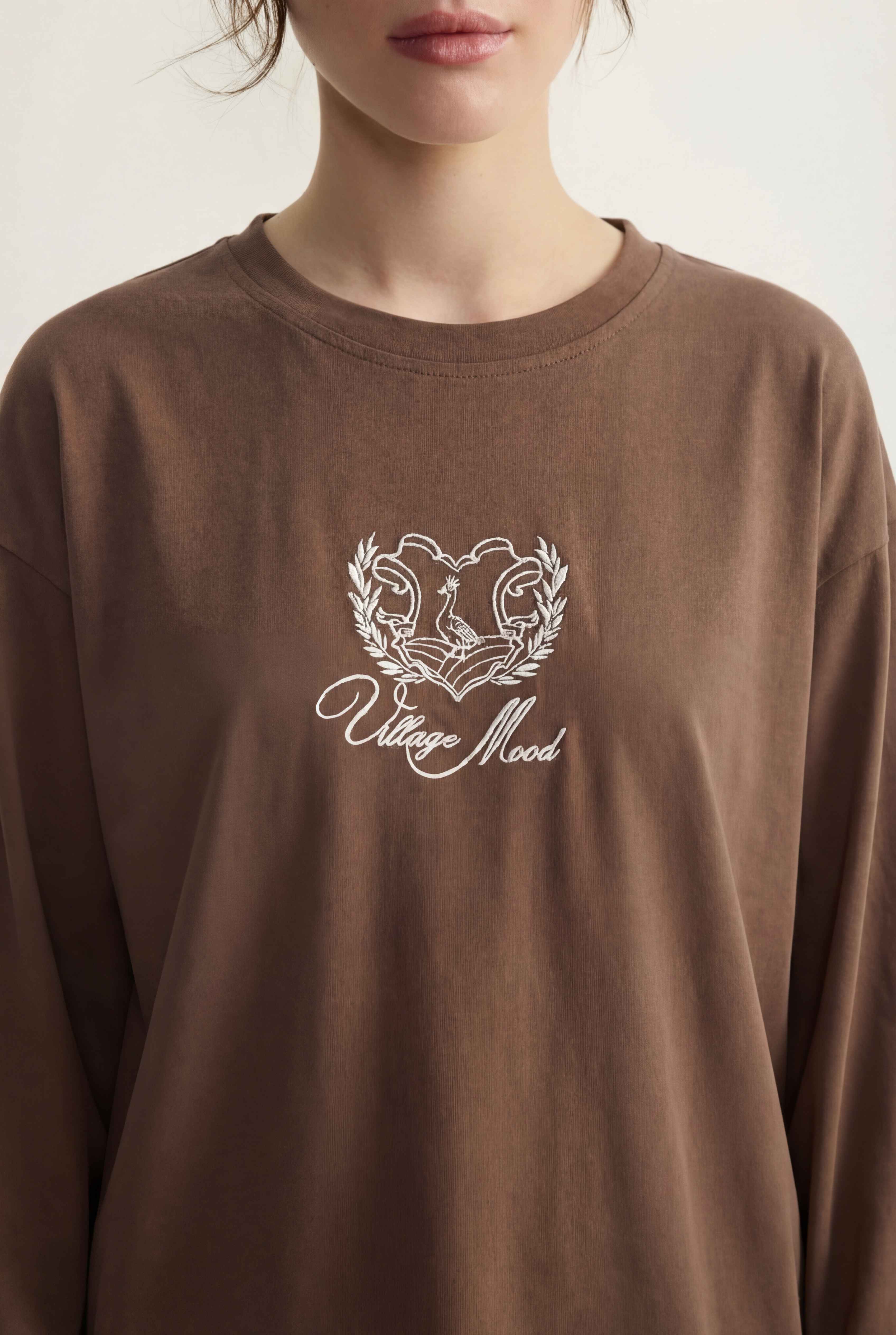 Базовый лонгслив в шоколадном оттенке — украсили его авторской вышивкой, напоминающей о детстве в деревне у бабушки.