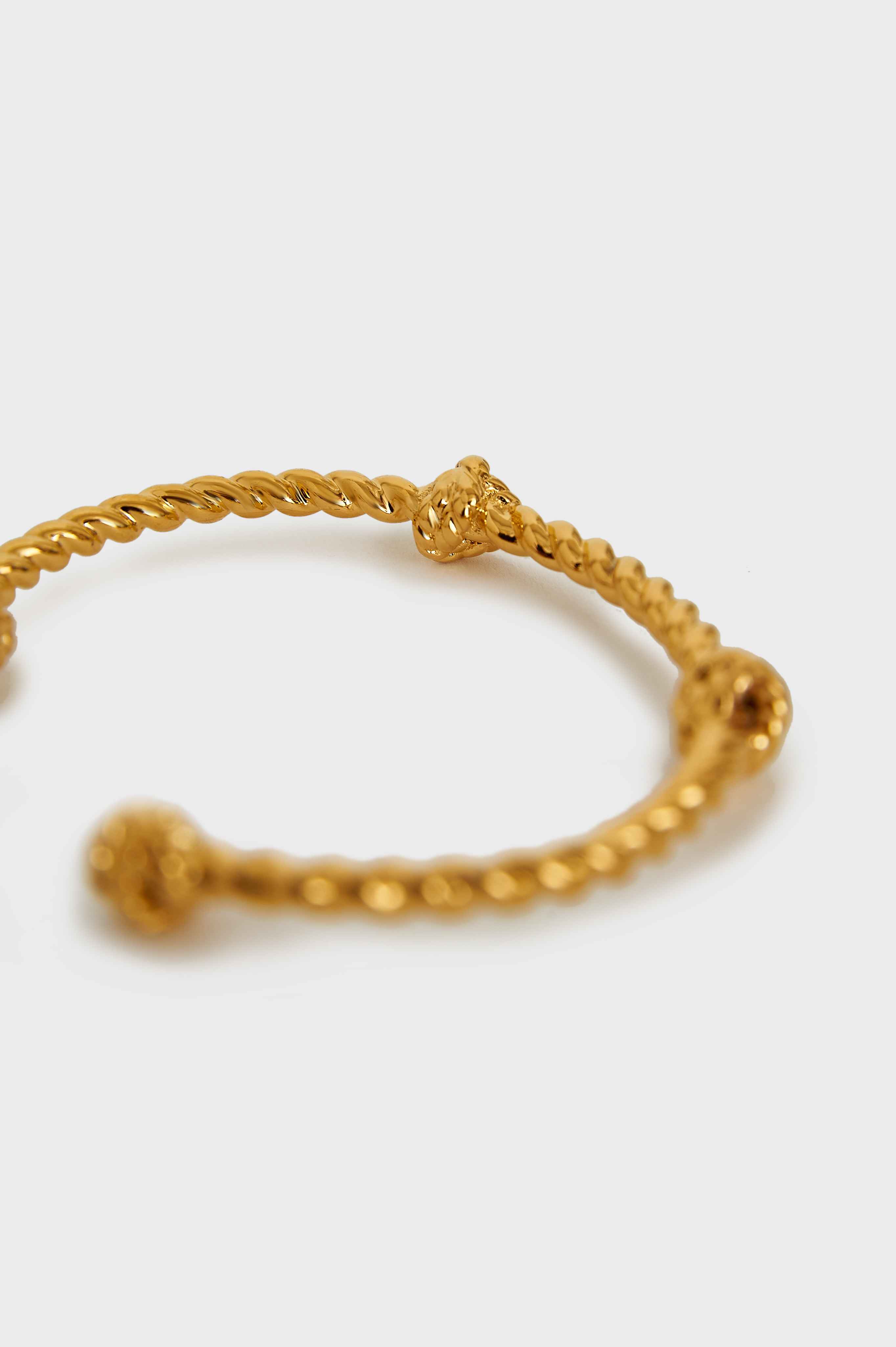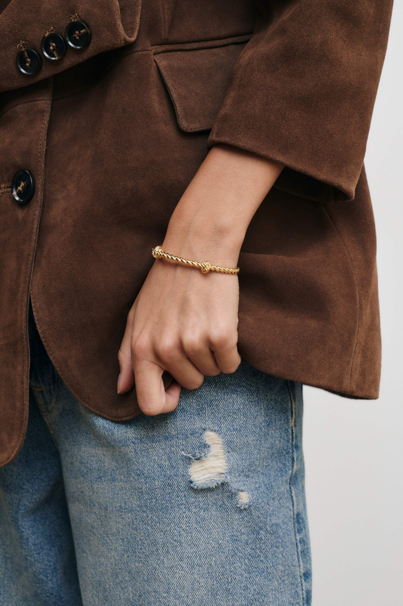 Плетение браслета напоминает туго скрученную веревку с узлами по длине. Незамкнутая конструкция позволяет аксессуару надежно обвить запястье, сохранив ощущение легкости.