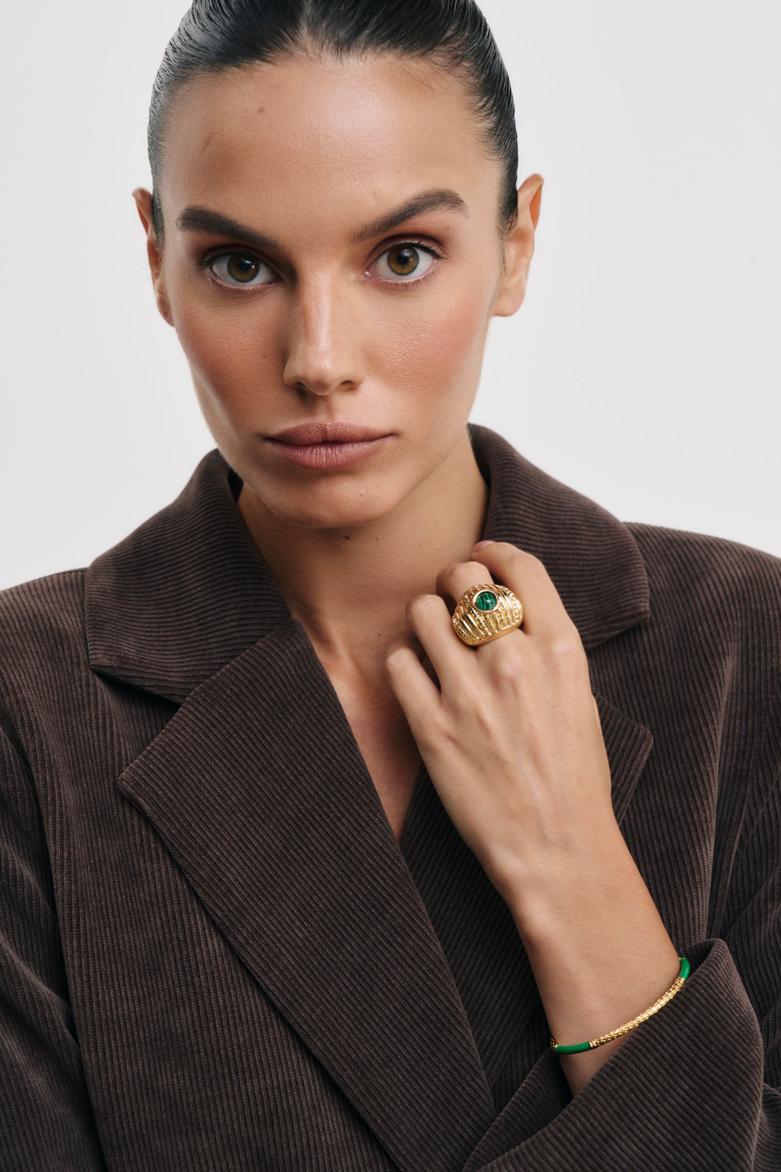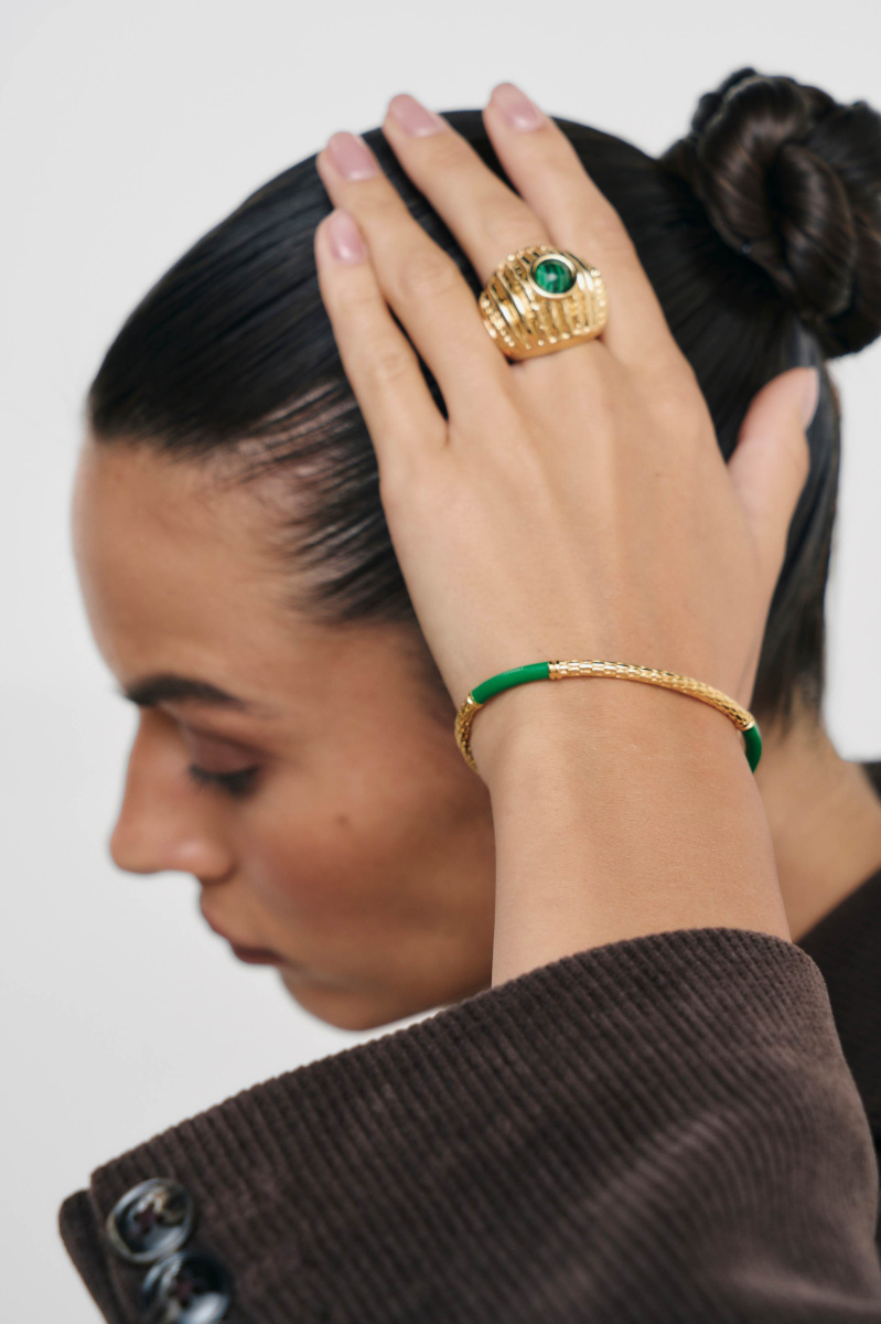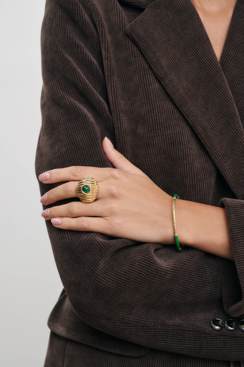 Новинка выполнена из латуни, покрытой позолотой 18 карат, и по центру дополнена малахитом.
