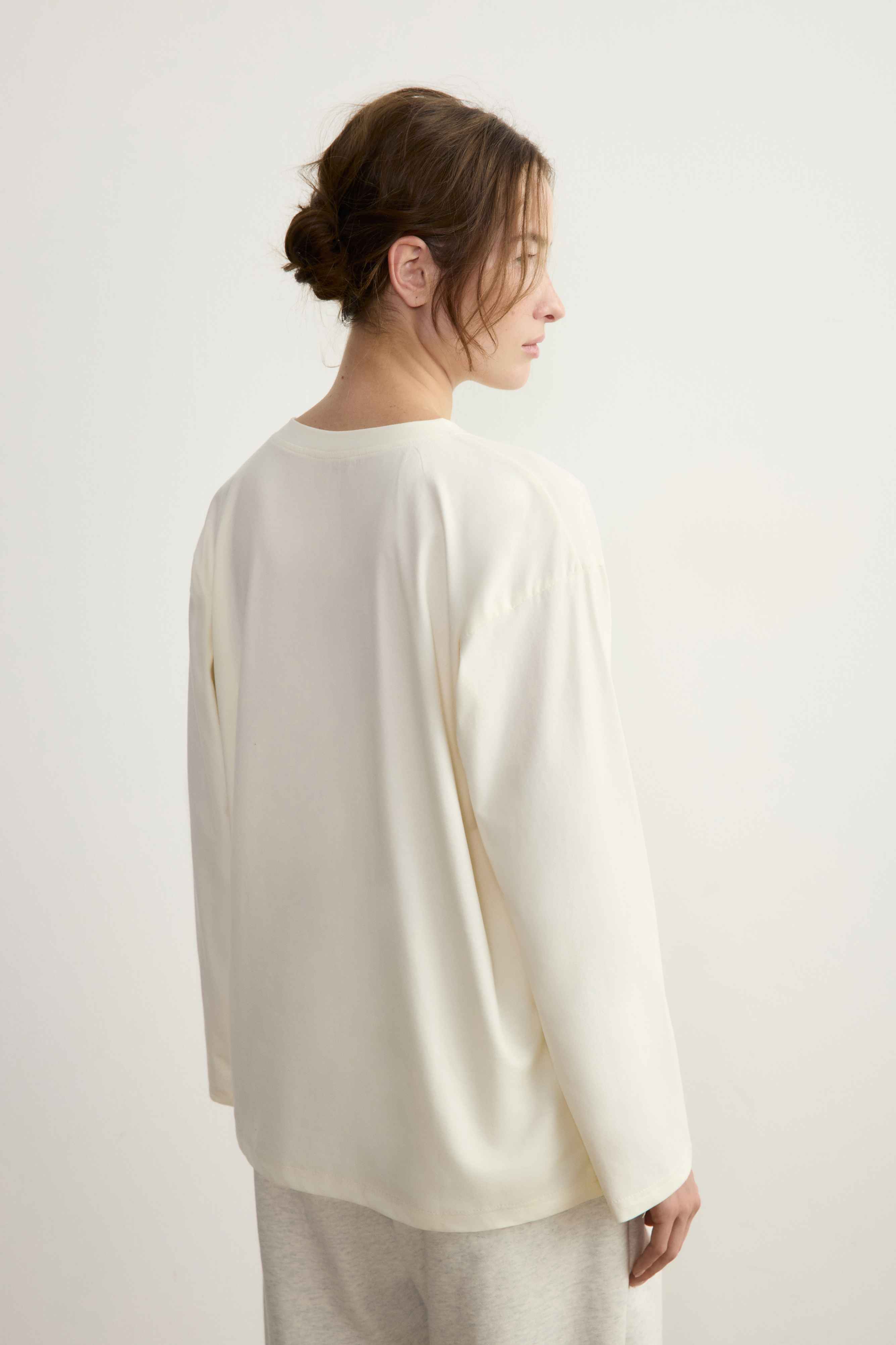3. Свободный, со спущенным плечом и круглым вырезом горловины — такой подойдет для любого образа и случая.